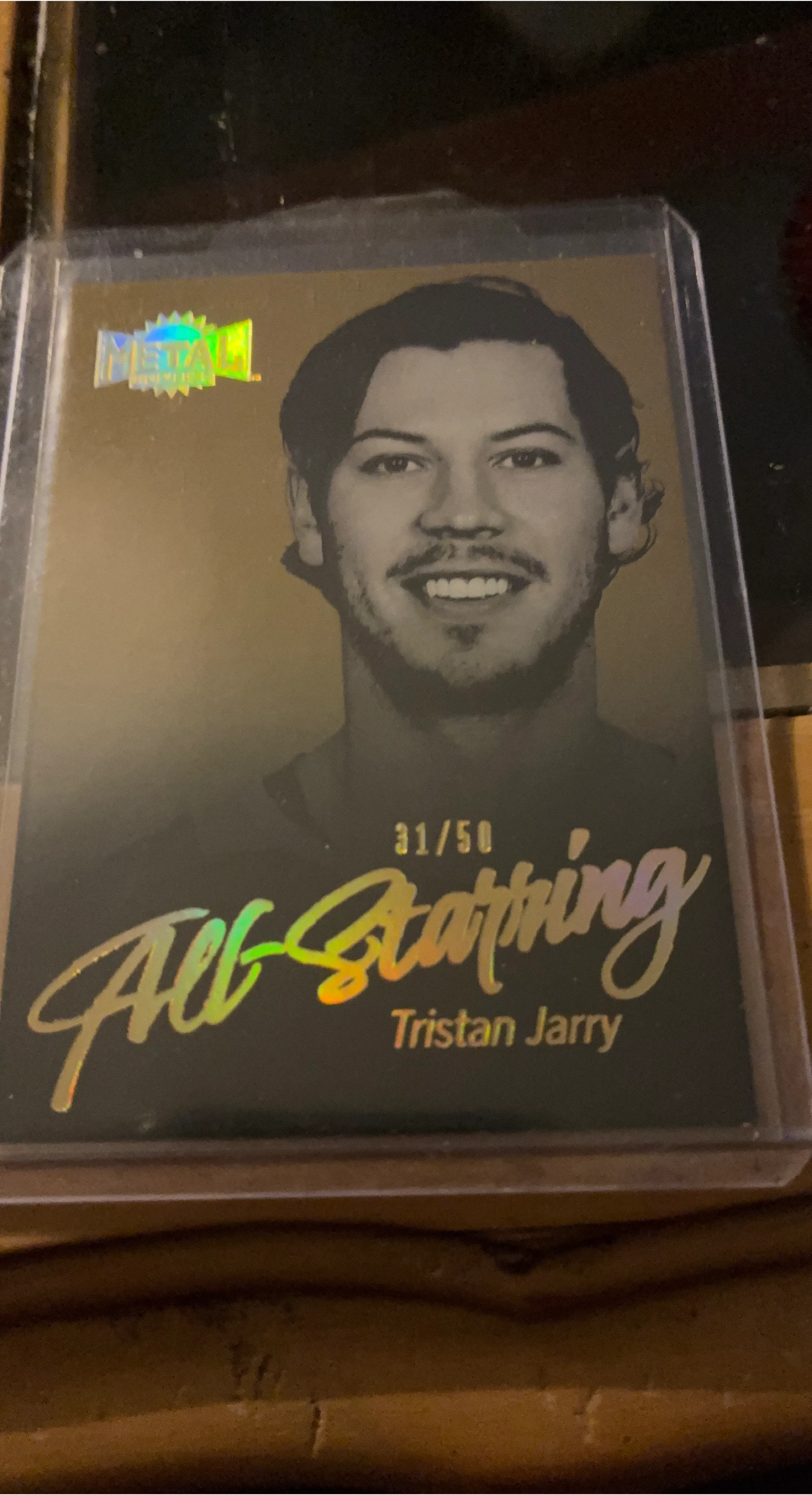 Metal All-Star trading card featuring Tristan Jarry. It's serial numbered 31 out of 50. This card is a collector's item for hockey fans.