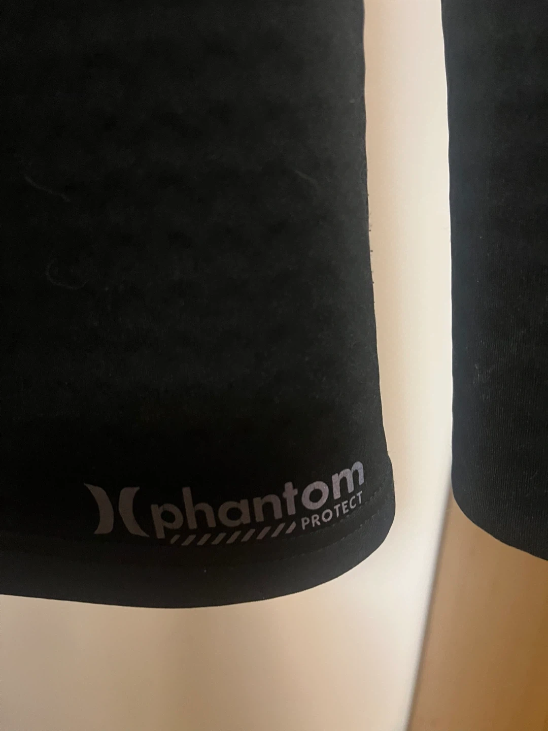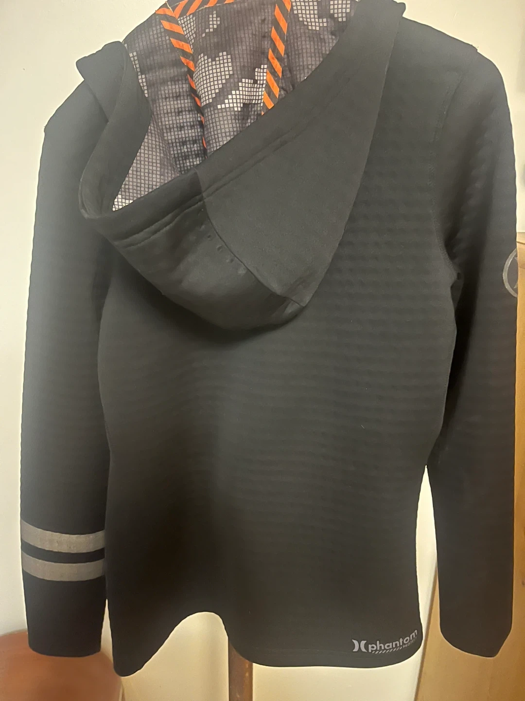 Black Hurley Phantom Protect hoodie with a comfortable fit. Features reflective stripes on the sleeves and a patterned interior lining for a touch of style. It's designed for durability and protection.