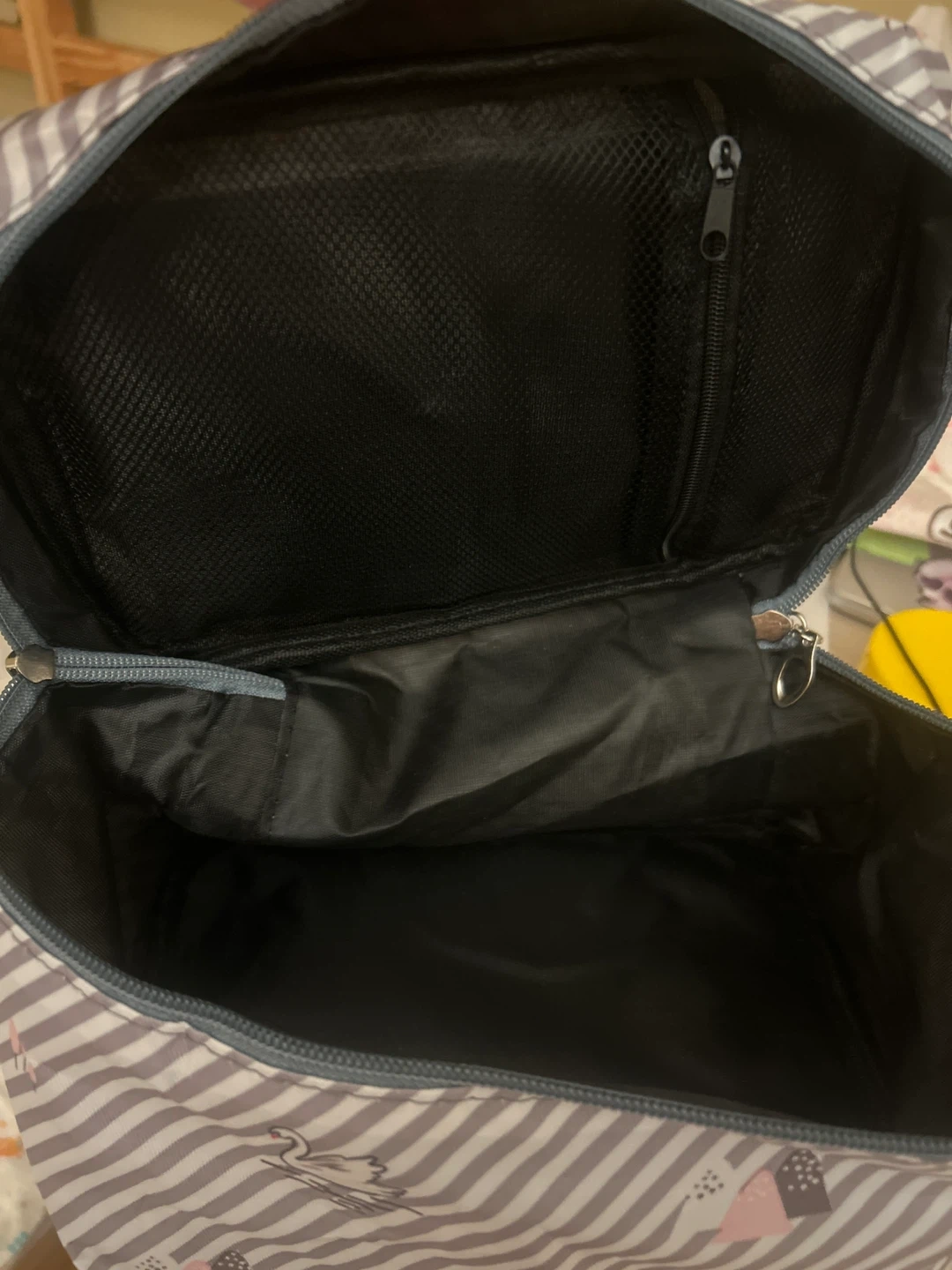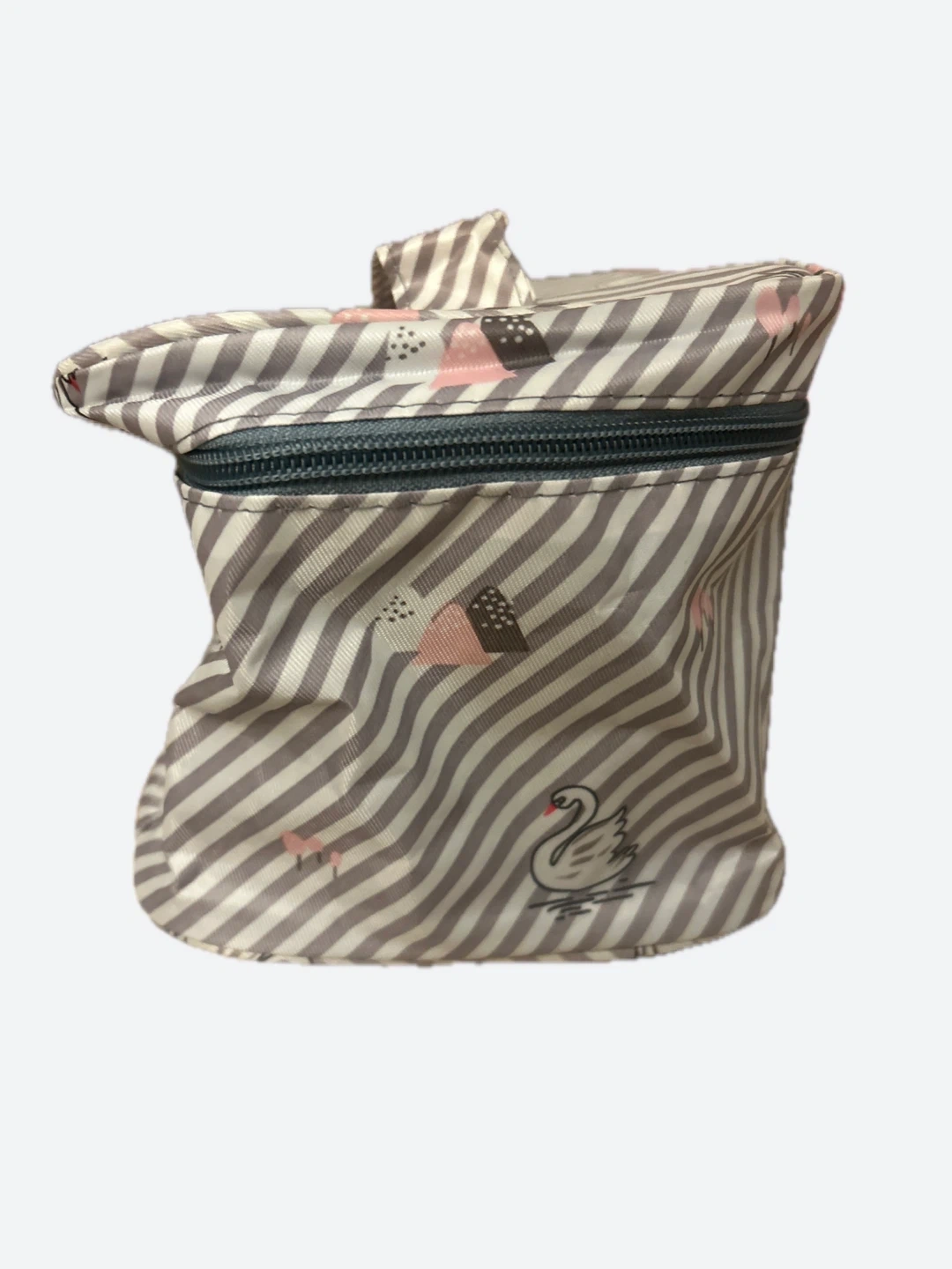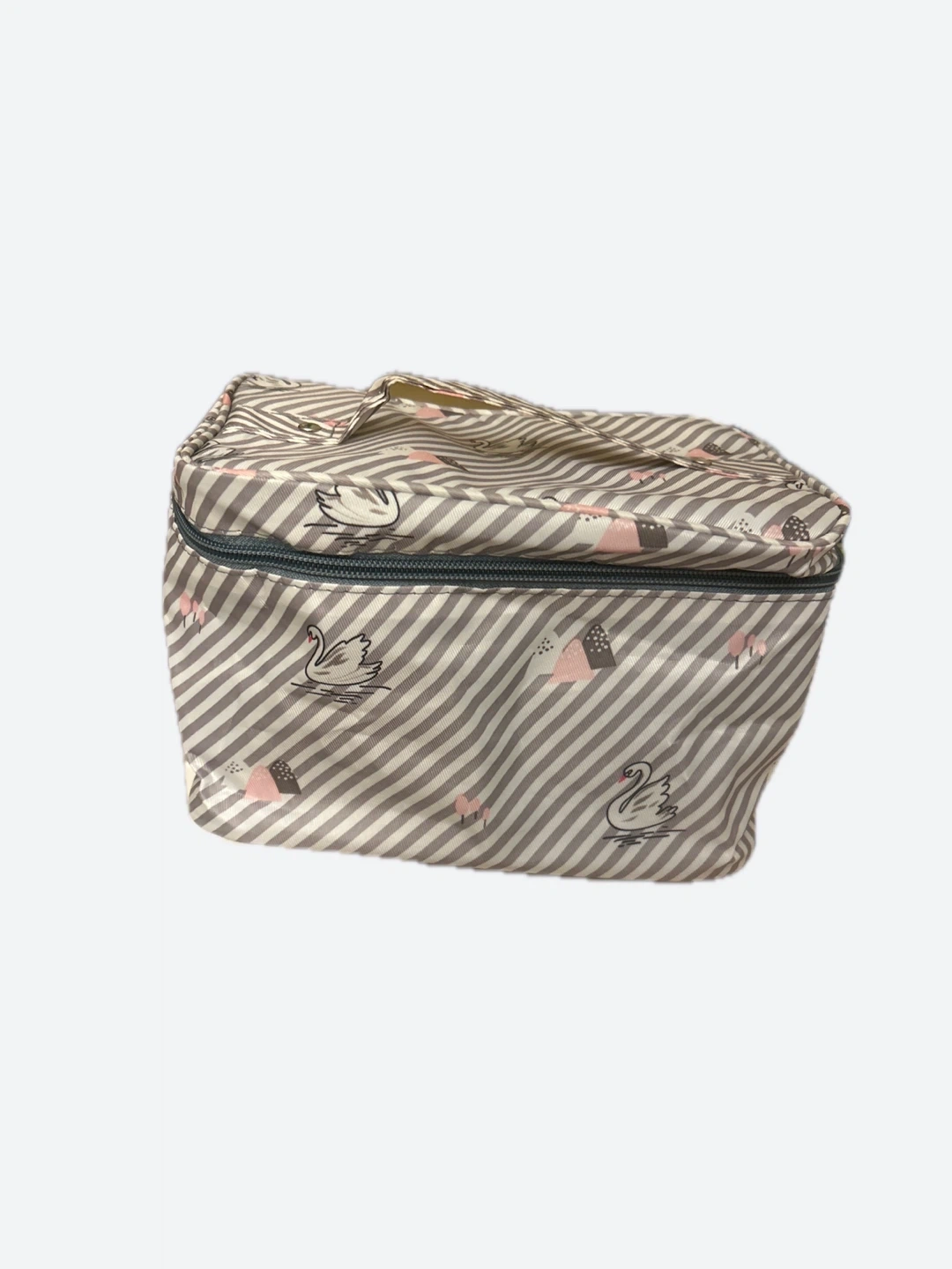 This cosmetic bag features a cute swan and mountain pattern with grey and white stripes. It's a handy size for travel or everyday use. The interior has a zippered mesh pocket for smaller items. New
