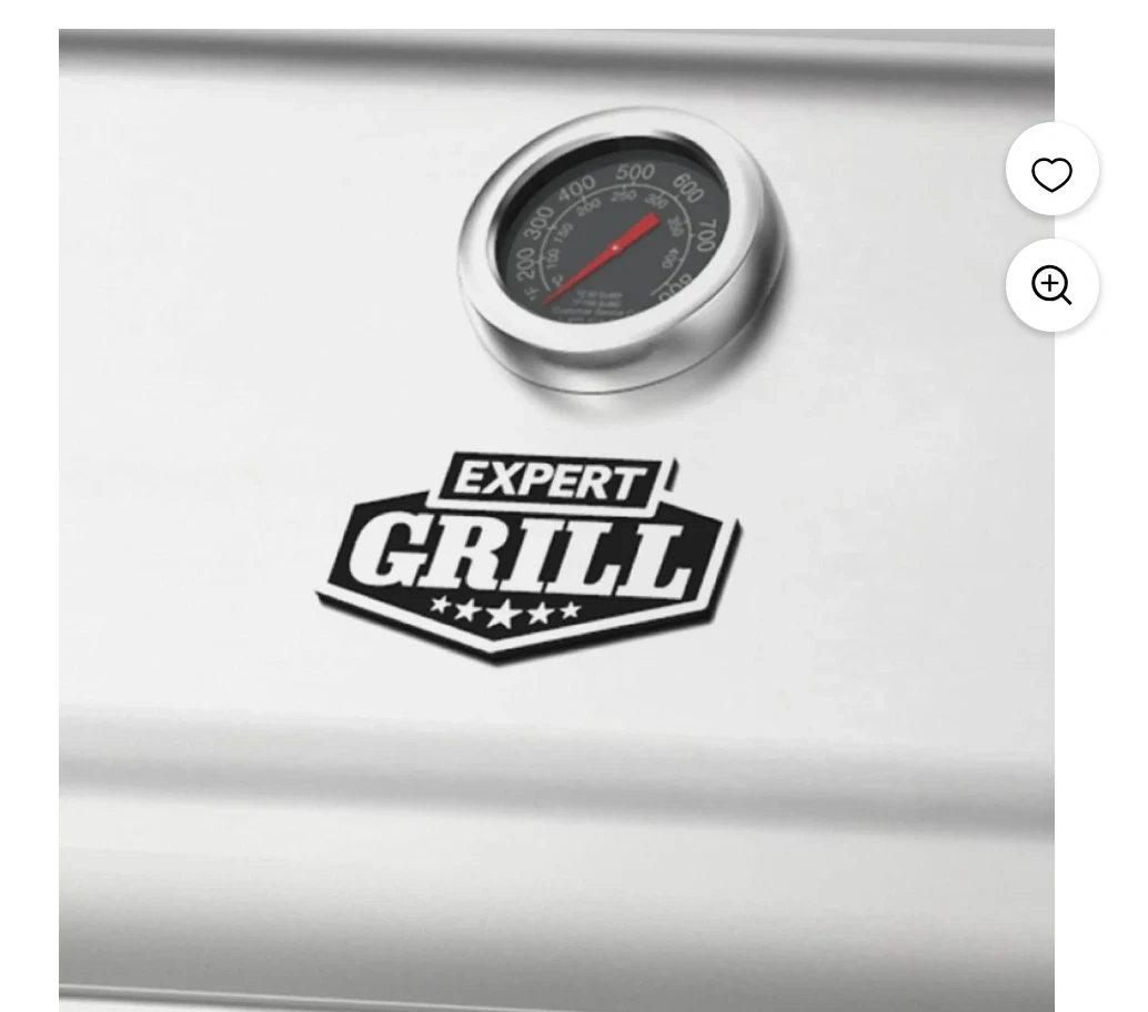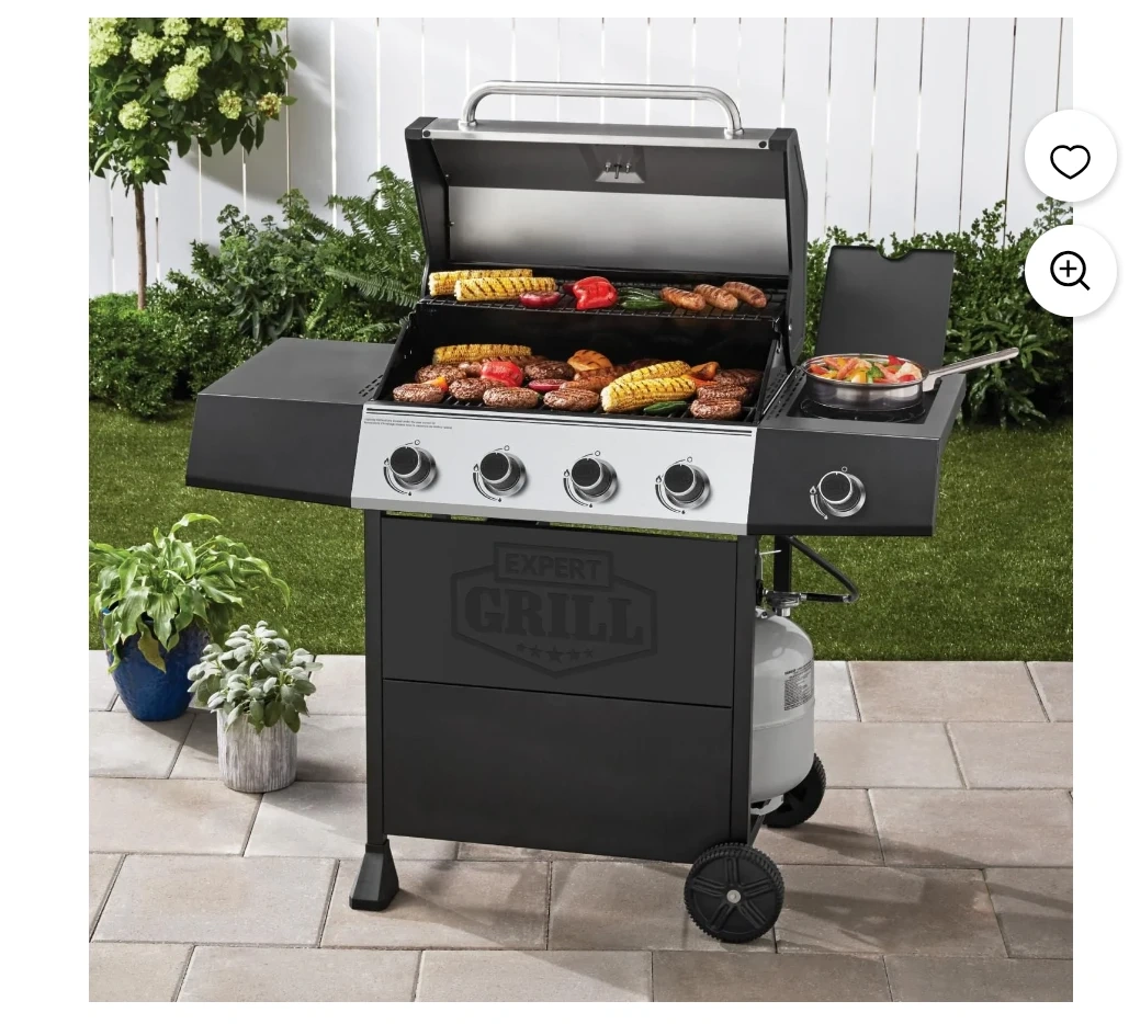 Expert Grill 4 burner propane gas BBQ. It has a side burner and a stainless steel lid. The grill includes a temperature gauge on the lid.