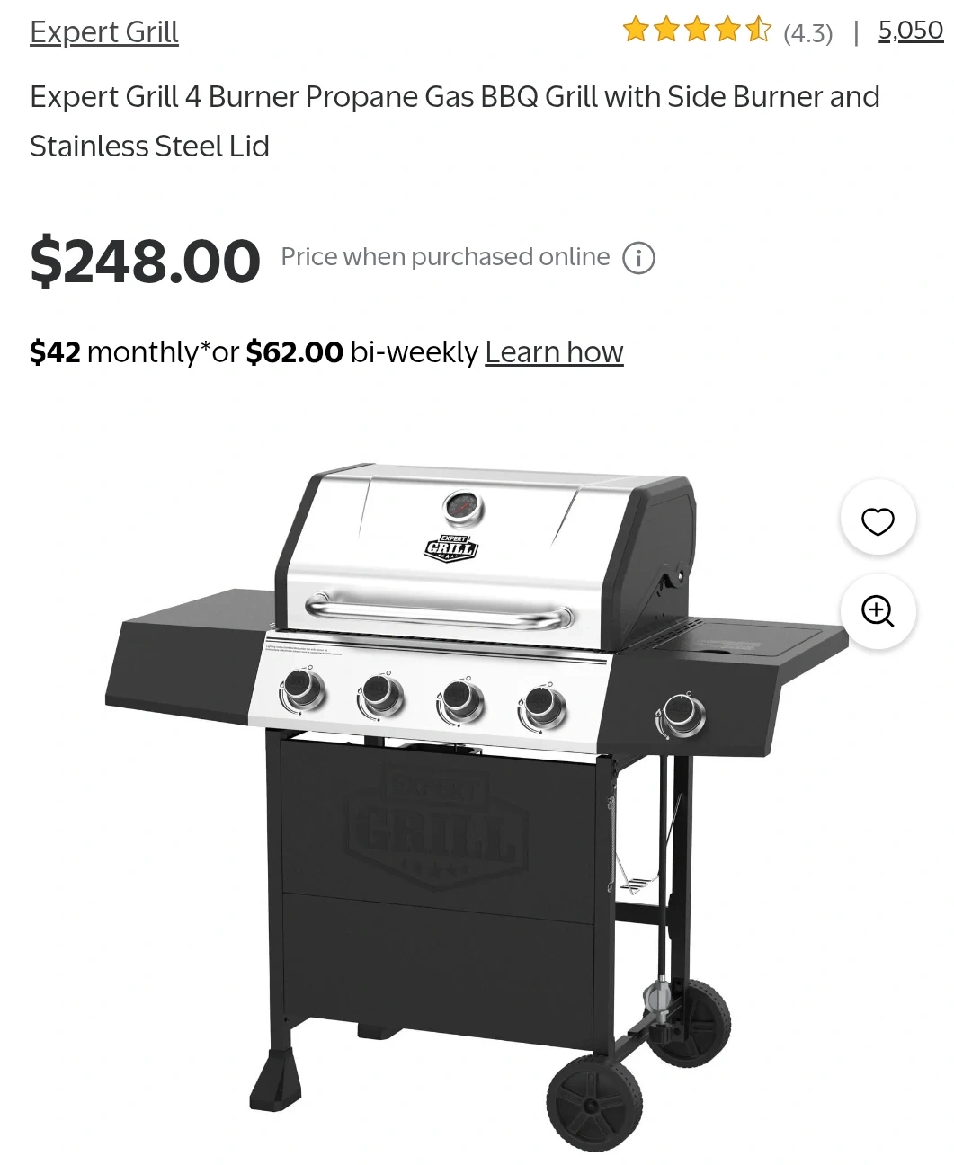Expert Grill 4 burner propane gas BBQ. It has a side burner and a stainless steel lid. The grill includes a temperature gauge on the lid.