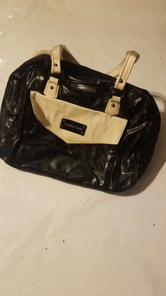 This Mary Kay handbag features a black quilted faux leather exterior with cream accents. It has a front flap pocket for easy access. A stylish accessory for everyday use!
