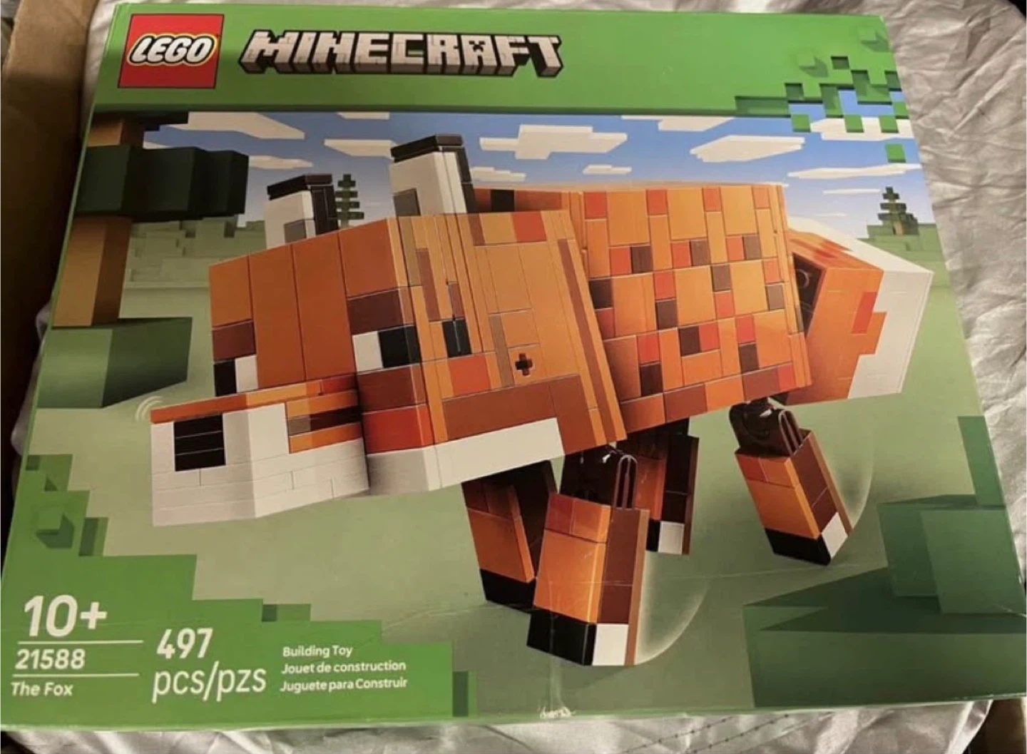 This is the LEGO Minecraft The Fox building set, number 21588. It contains 497 pieces. It's a building toy designed for ages 10 and up. It's perfect for builders who love Minecraft!