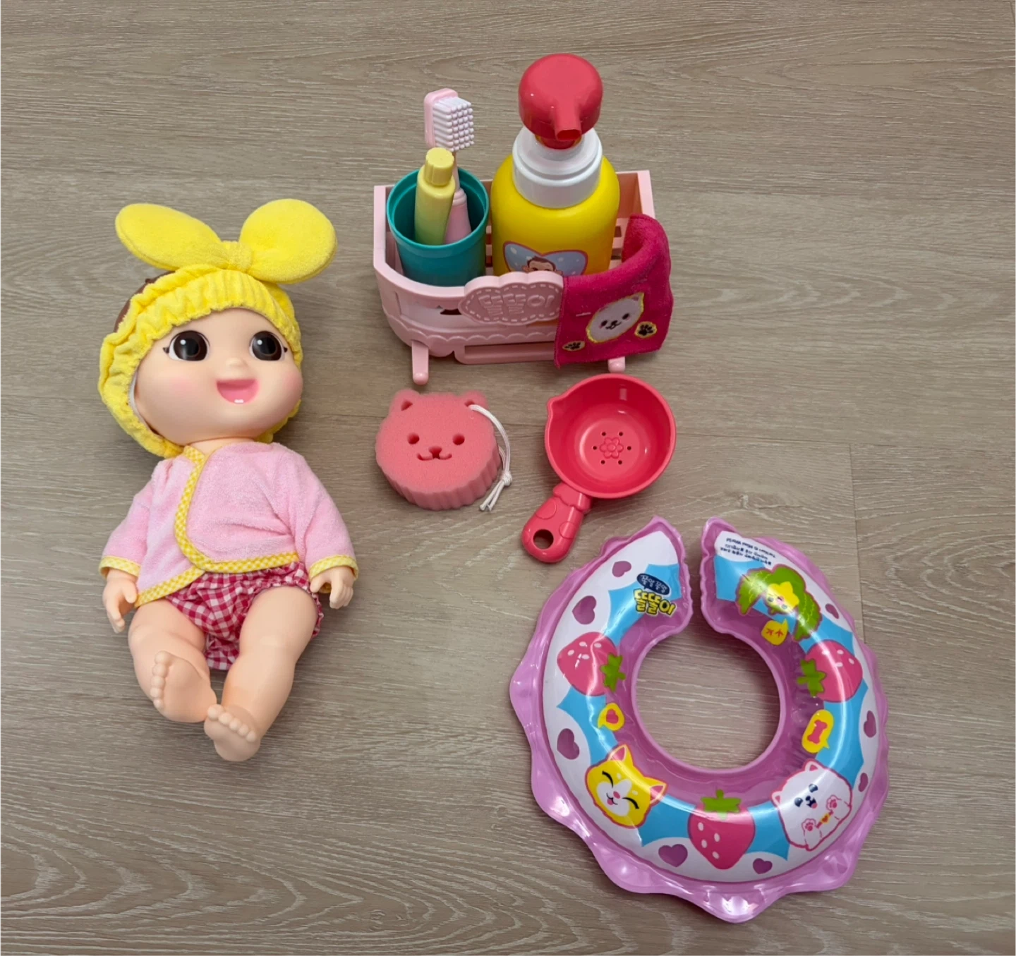 This set includes a baby doll, a bath caddy with toothbrush and toothpaste, a rubber ducky-shaped sponge, a small scoop, and a strawberry-themed inflatable neck float. It's designed for bathtime fun!