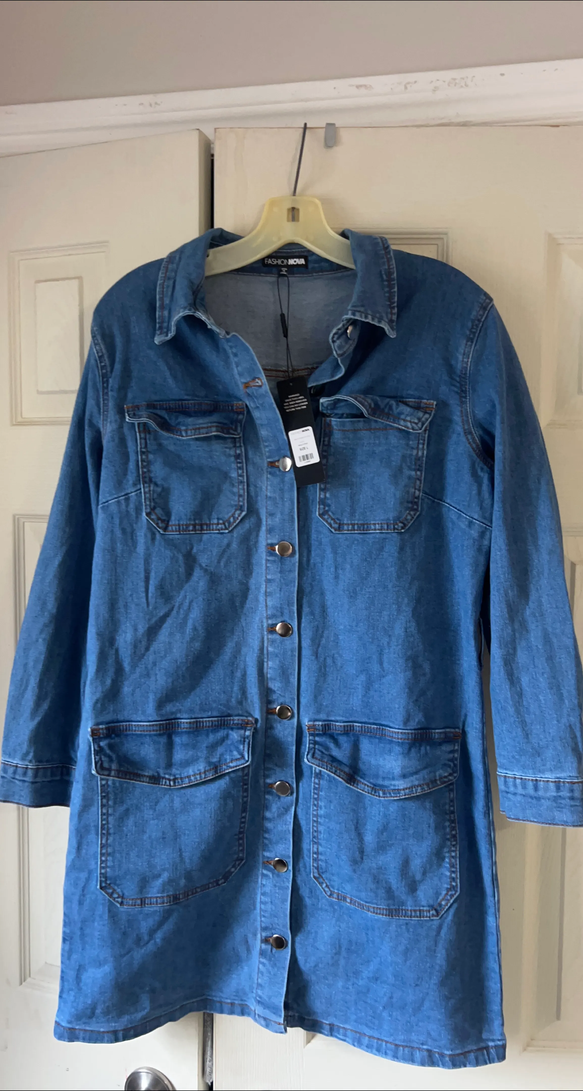 Selling a Fashion Nova denim dress in size large. It's in excellent condition. The dress features a button-down front and four front pockets. Perfect for a casual and stylish look!