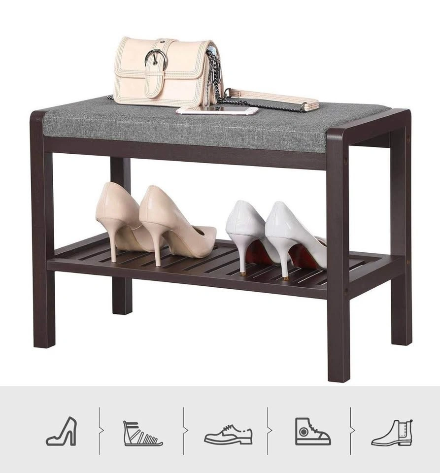 Stylish and practical shoe bench made of natural bamboo with a soft padded cushion. Perfect for an entryway, hallway, bedroom, or mudroom. Combines comfortable seating with shoe storage to keep your space neat and organized.