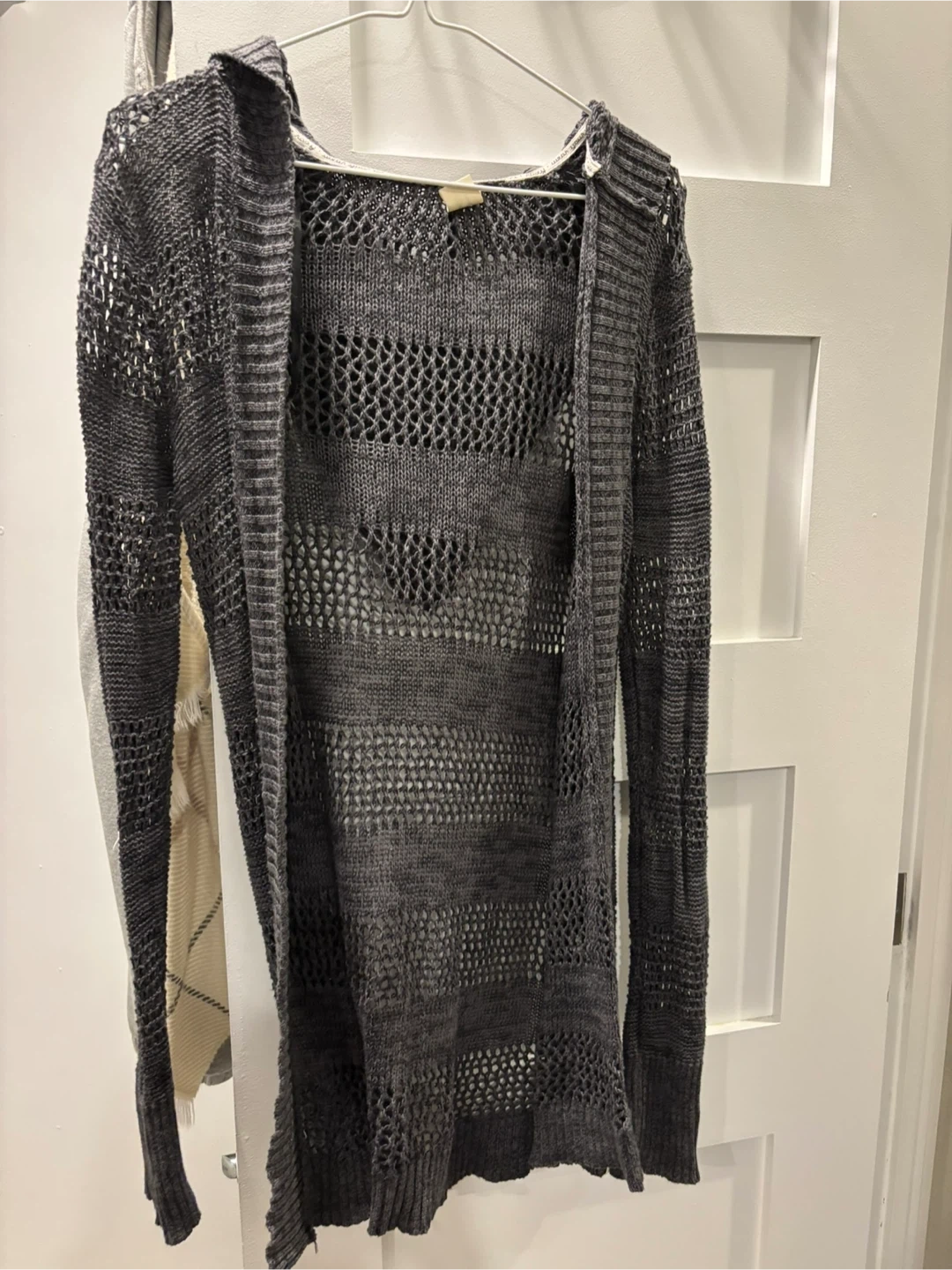 A grey hooded open knit cardigan with a long sleeve design. It features a mix of ribbed and mesh knit patterns throughout. It's a lightweight layering piece.