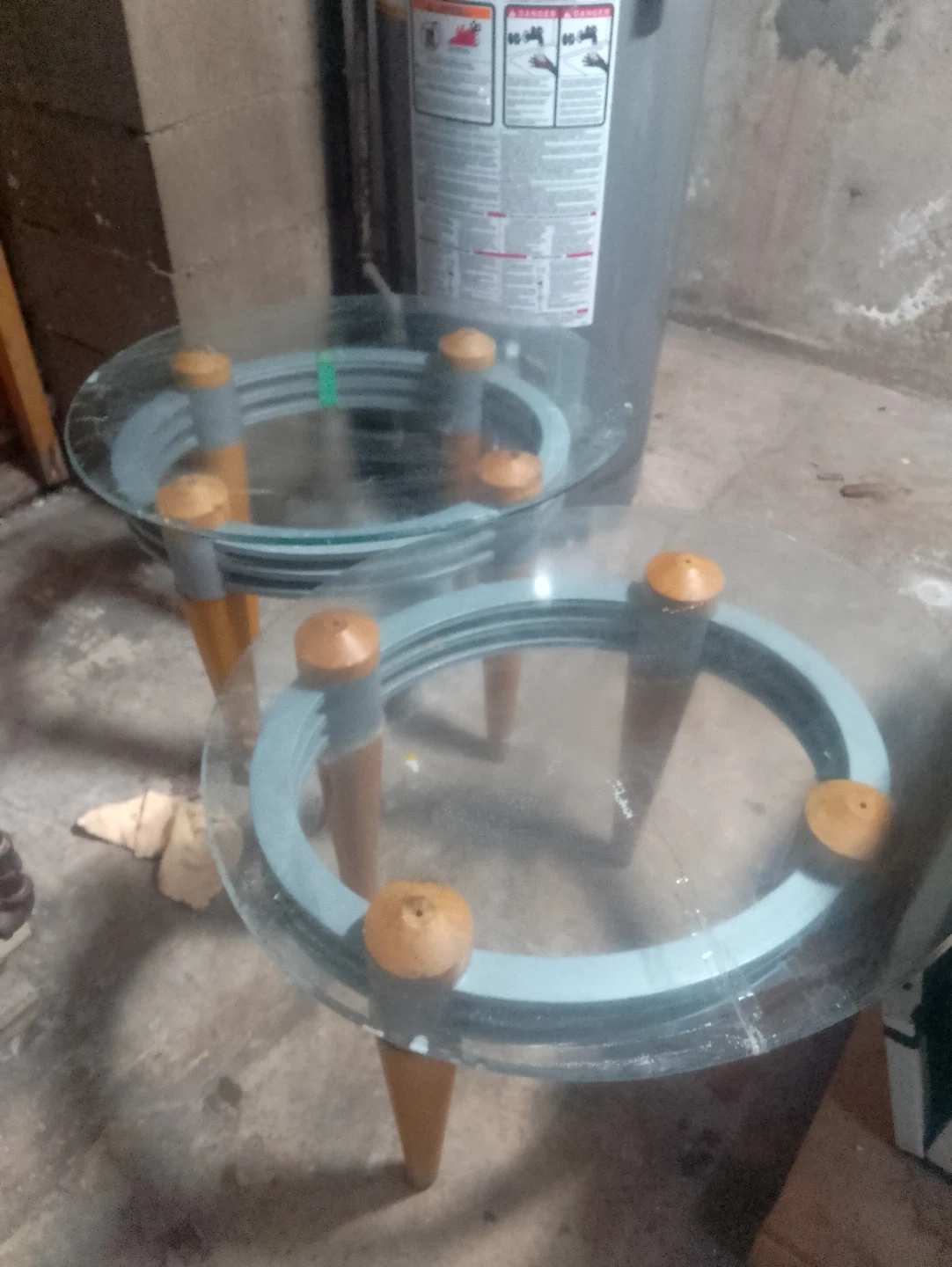 Set of two round glass top side tables with wooden legs. Tables have a light blue accent ring. They're perfect for adding a touch of modern style to any living space. Diameter is approximately 18 inches.