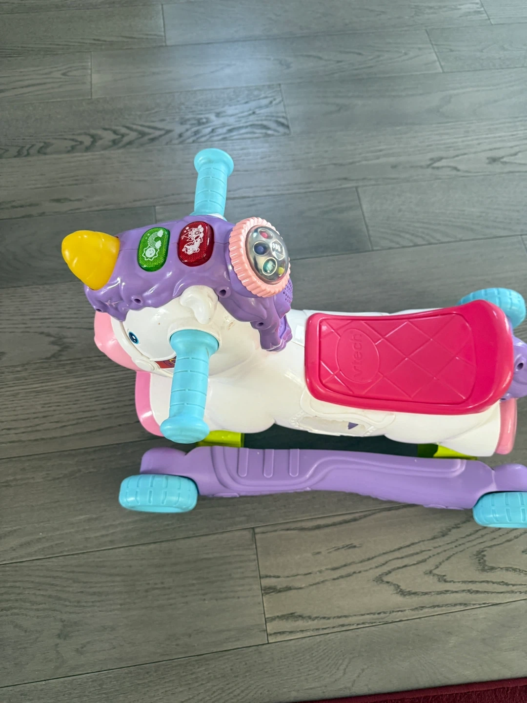 This VTech Rock & Ride Unicorn is ready for a new kiddo! It's a fun and interactive toy for toddlers, perfect for rocking and riding adventures. Your little one will love the bright colours and engaging features of this unicorn!