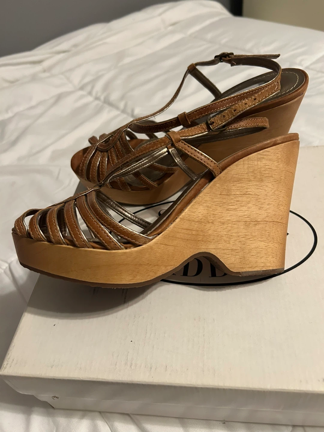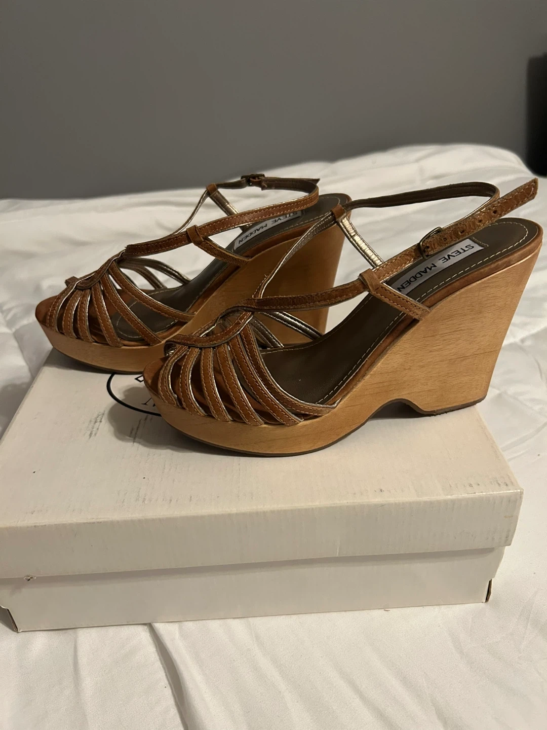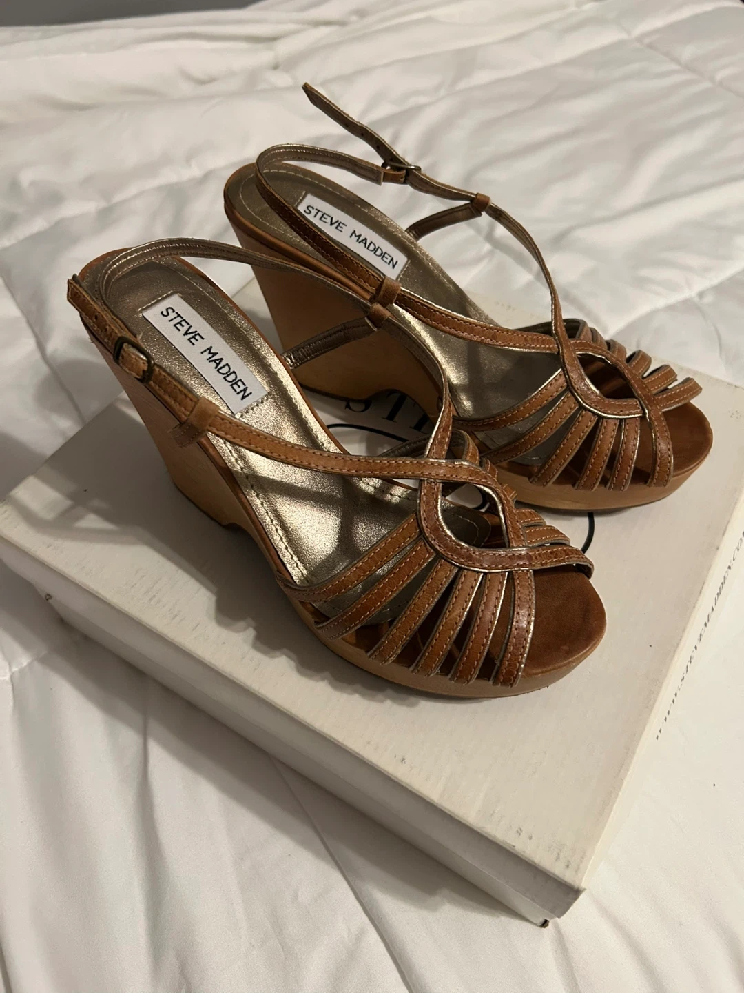 Vintage Y2K Steve Madden Astoriaa Tan Leather & Wood Wedge Sandals with Gold. Tan wedges with strappy design. Size is not marked and torn off box but they fit me - a size 6.5. These are in excellent vintage condition with no obvious wear on bottom and only minor scuff on side noted in picture. These are rare being in like new condition!