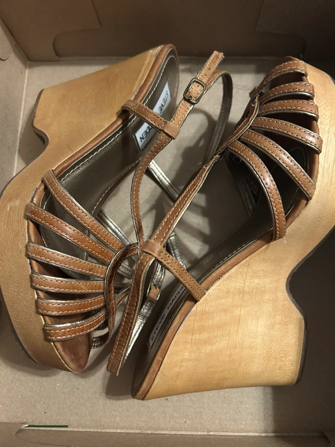 VTG Y2K Steve Madden Astoriaa Tan Leather & Wood Wedge Sandals
