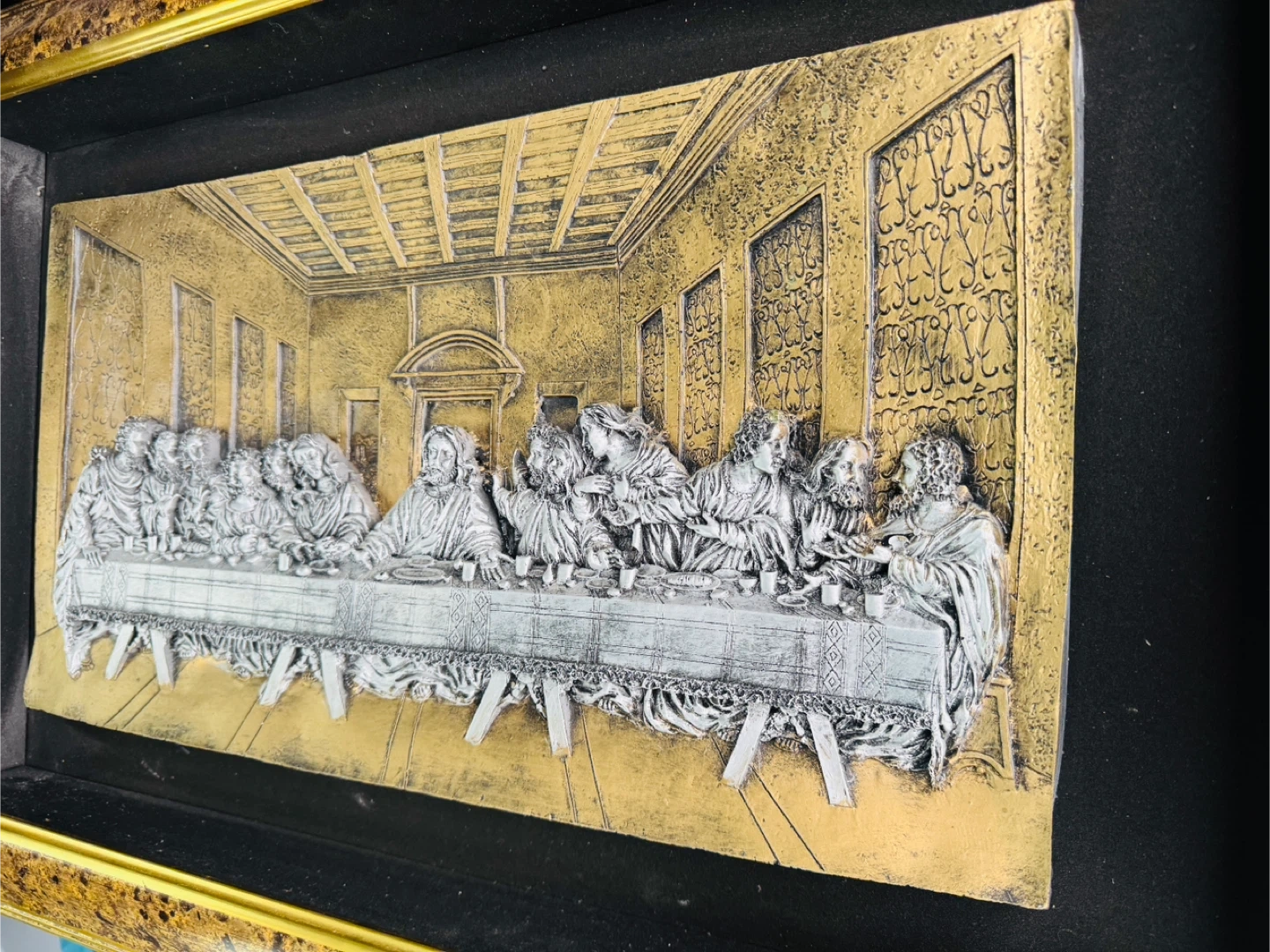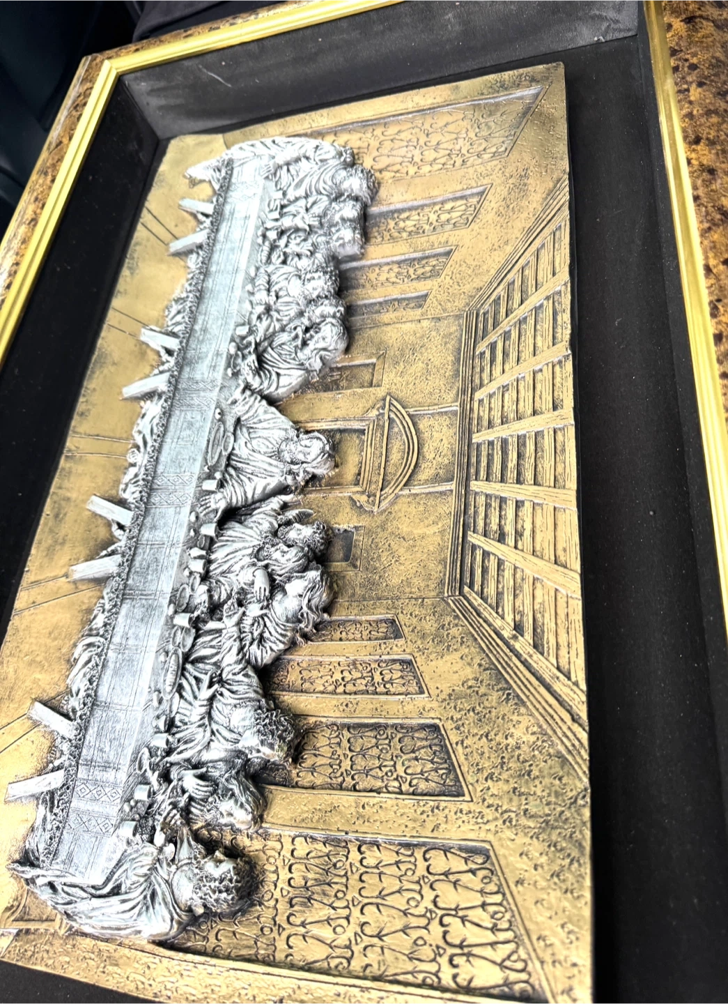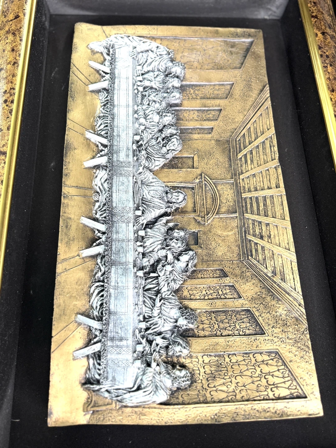 This framed art piece depicts "The Last Supper" in a detailed relief design. It features a metallic gold background with silver-toned figures and architectural details. The piece is presented in a decorative frame, ready to hang. Framed "The Last Supper" Relief Art Piece (30”x20”)