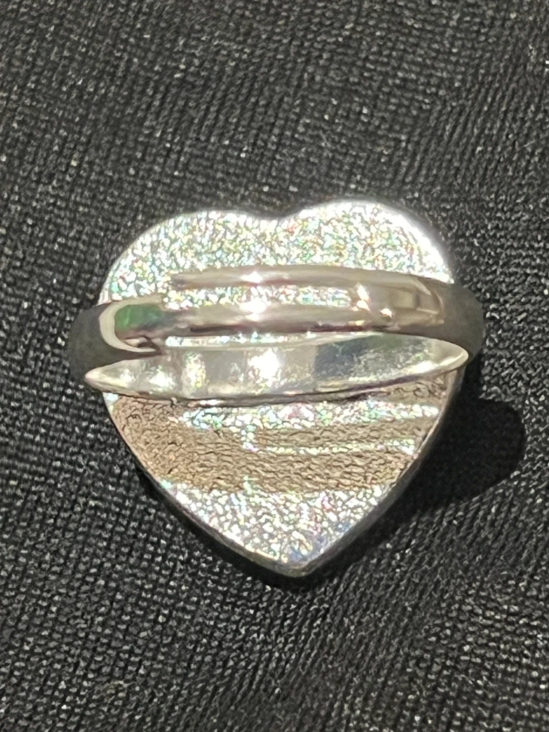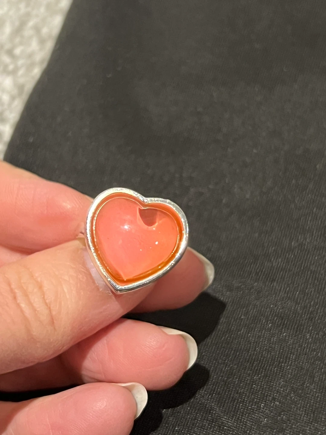 This is a fun heart-shaped ring with a vibrant pink stone. The band is silver-toned. It's a unique accessory that adds a pop of colour to any outfit. It's a great statement piece for casual wear!