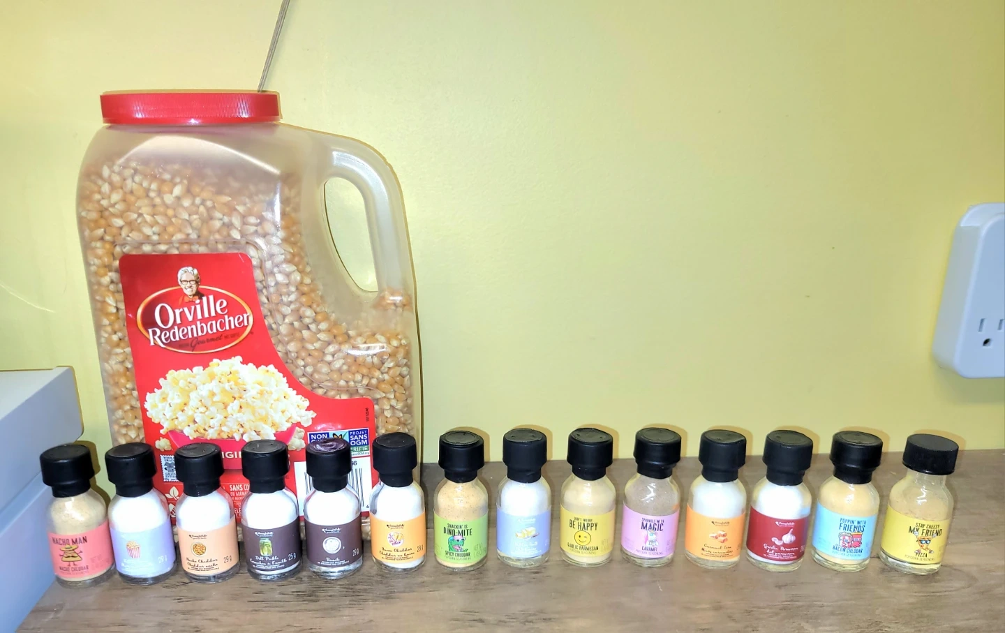 A large tub of Orville Redenbacher Original popcorn kernels comes with 12 individual popcorn seasonings. Enjoy flavours like Pizza, Bacon Cheddar, and Butter Salt! These seasonings are great for movie nights or any time you want to jazz up your popcorn.