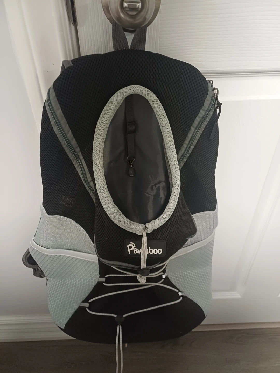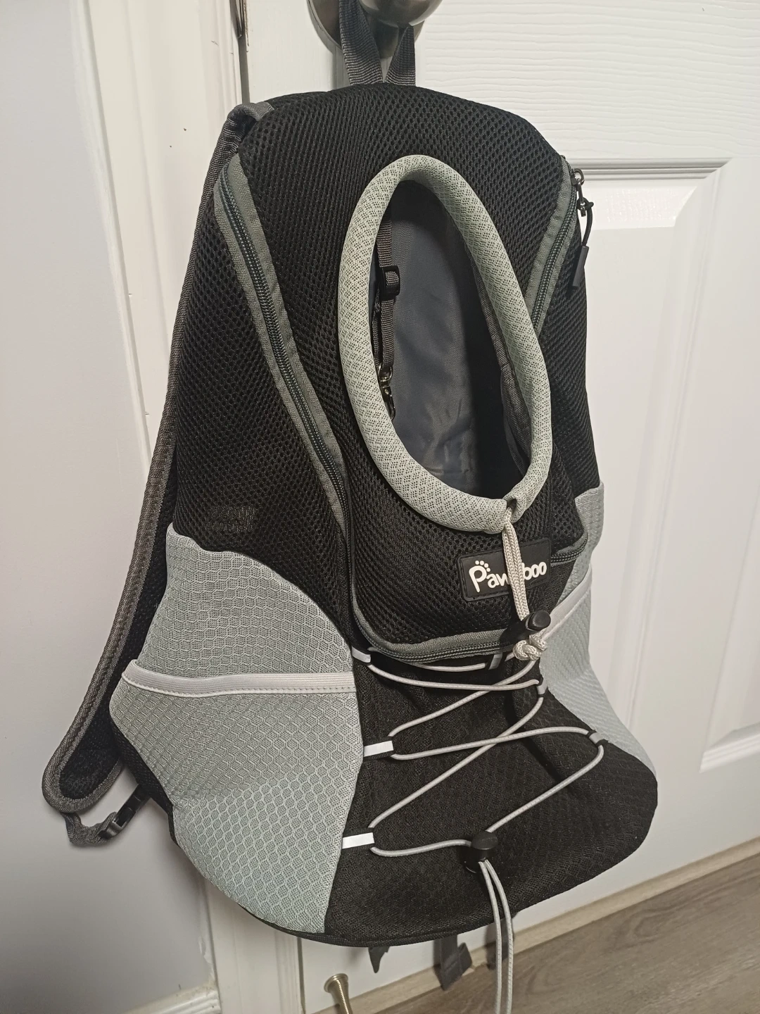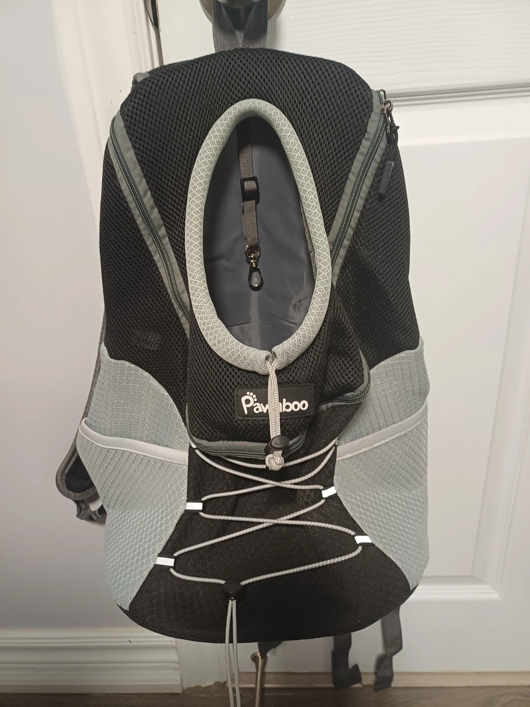 This Pawaboo backpack carrier is designed for dogs and cats. It features a mesh design for ventilation and adjustable straps for comfort. Includes a safety leash clip inside and a padded bottom for your pet. Great for travel or walks!