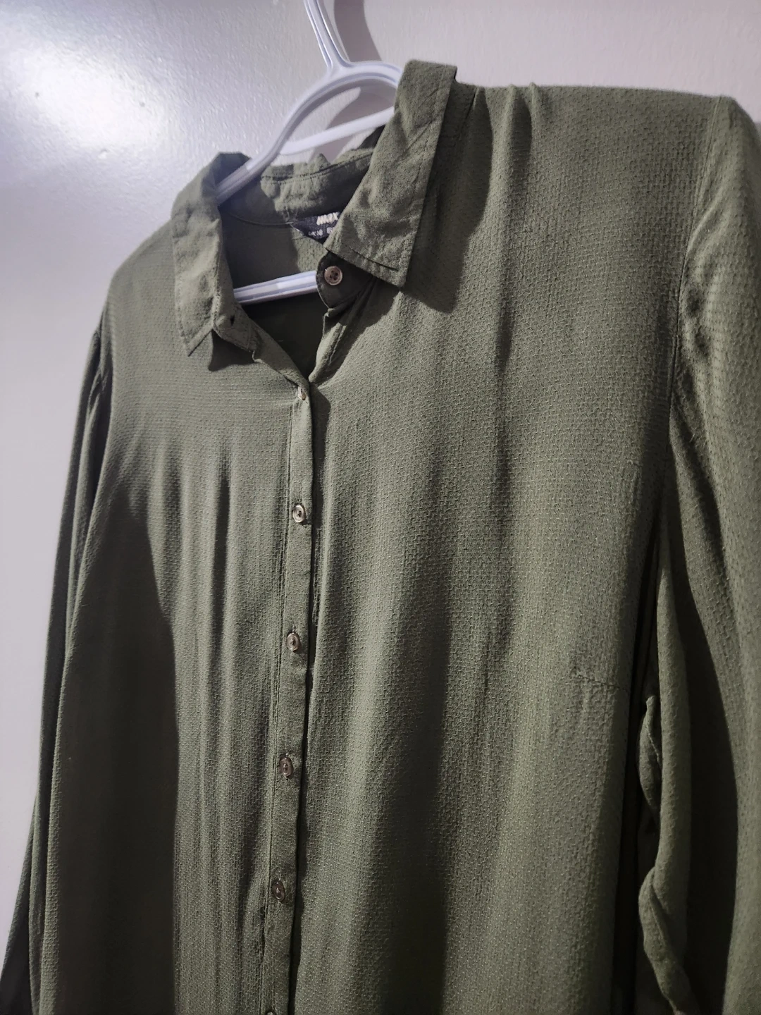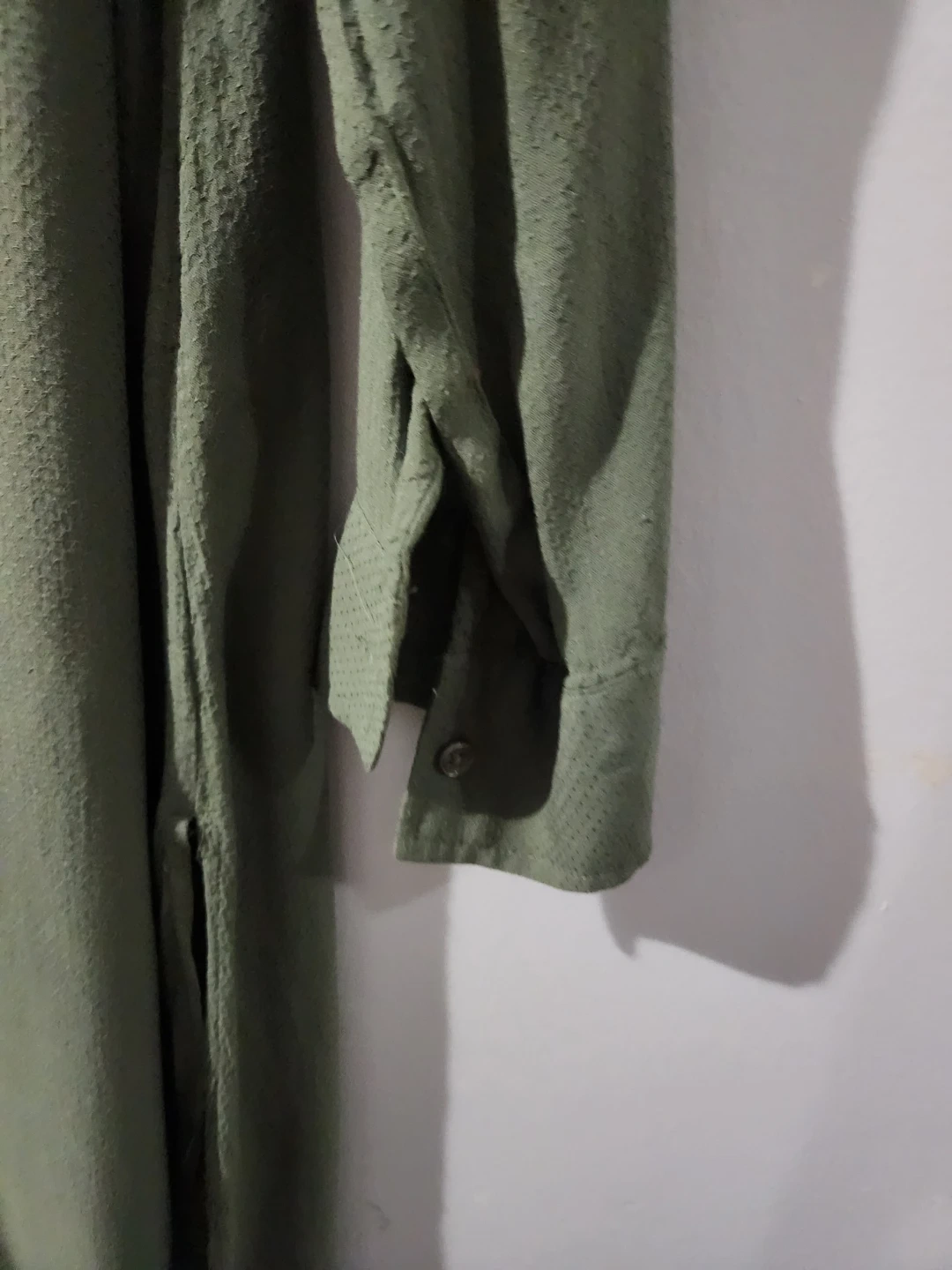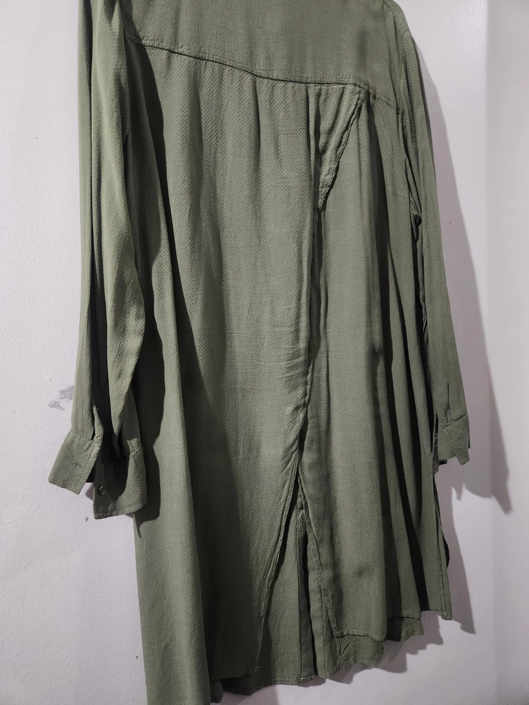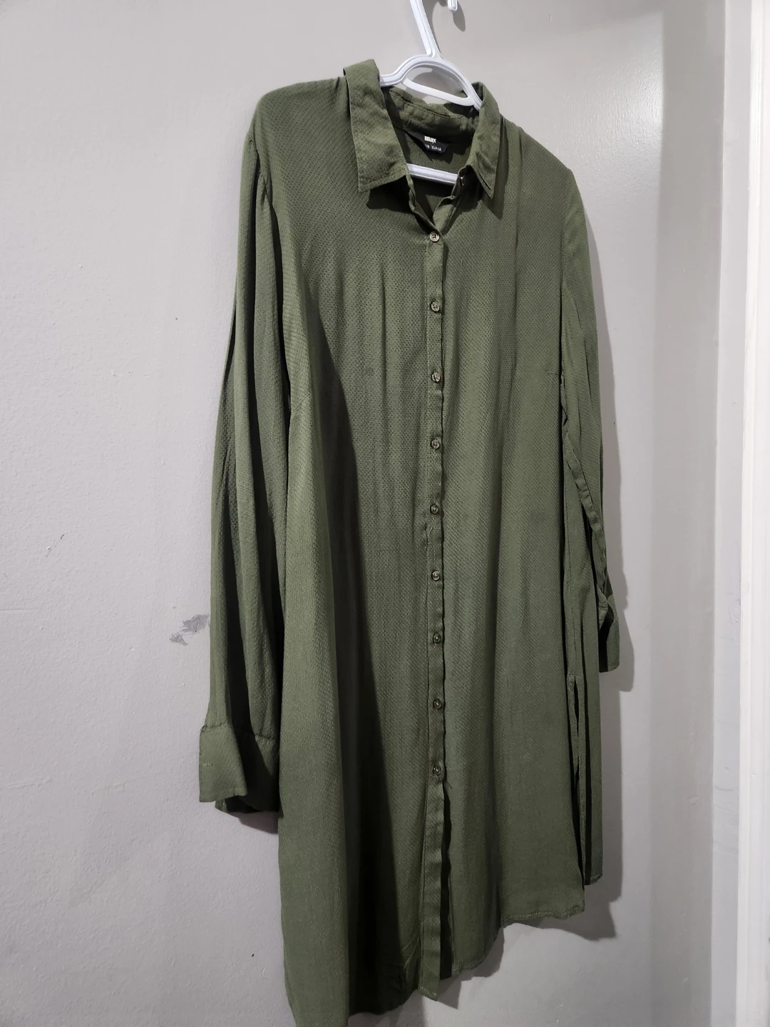 This ASOS DESIGN shirt dress comes in an oversized midi length. It's a khaki green colour with a textured fabric and button-up front. A great versatile piece for any wardrobe! chest 23, waist 22 inches. soft stuff. easy to wear.