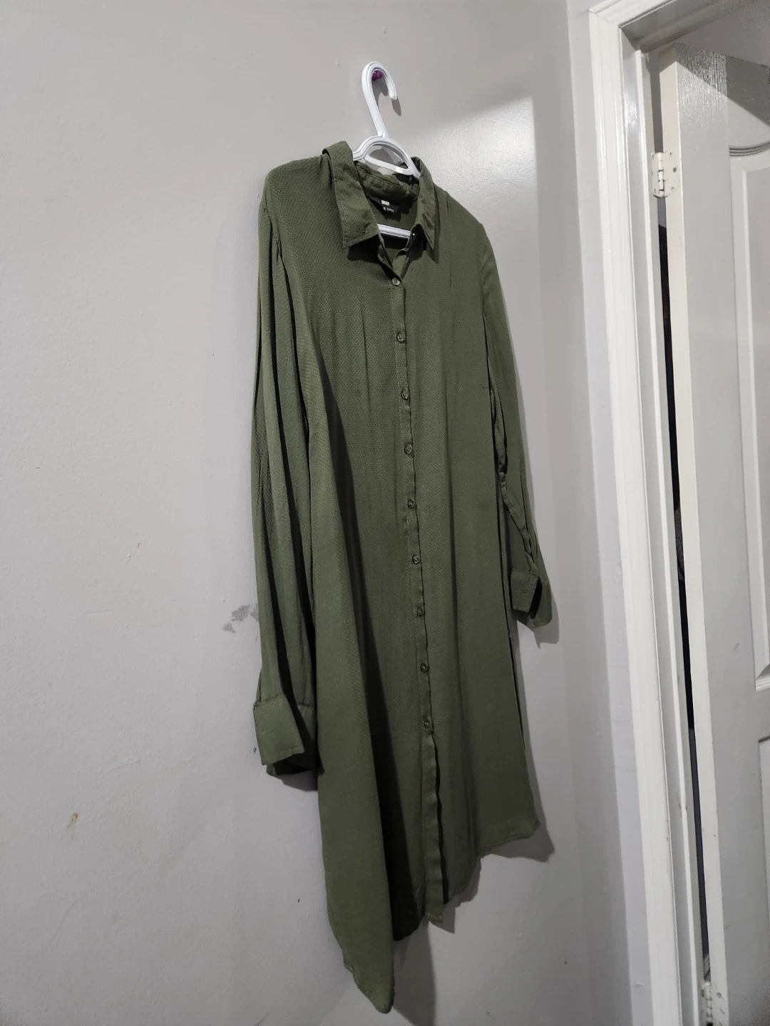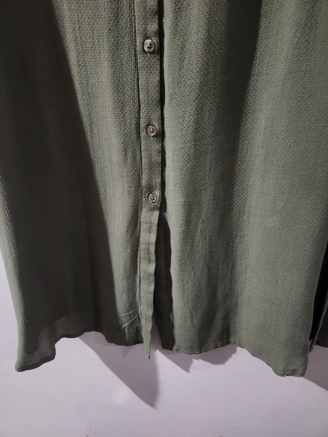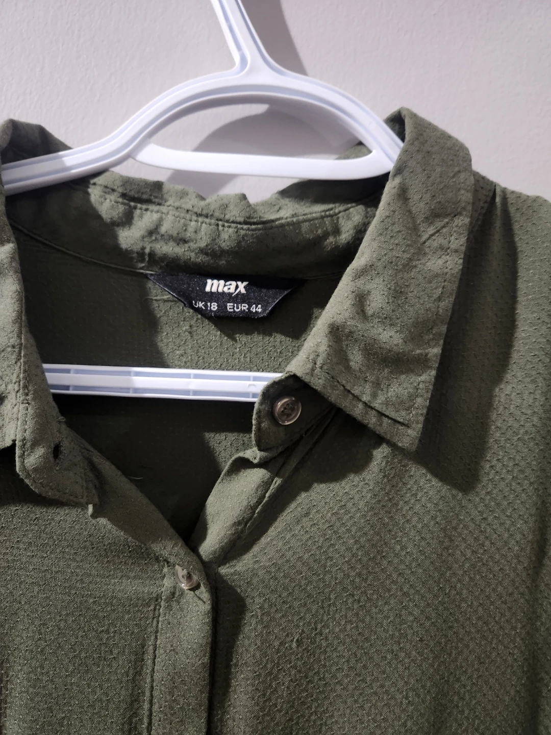 This ASOS DESIGN shirt dress comes in an oversized midi length. It's a khaki green colour with a textured fabric and button-up front. A great versatile piece for any wardrobe! chest 23, waist 22 inches. soft stuff. easy to wear.