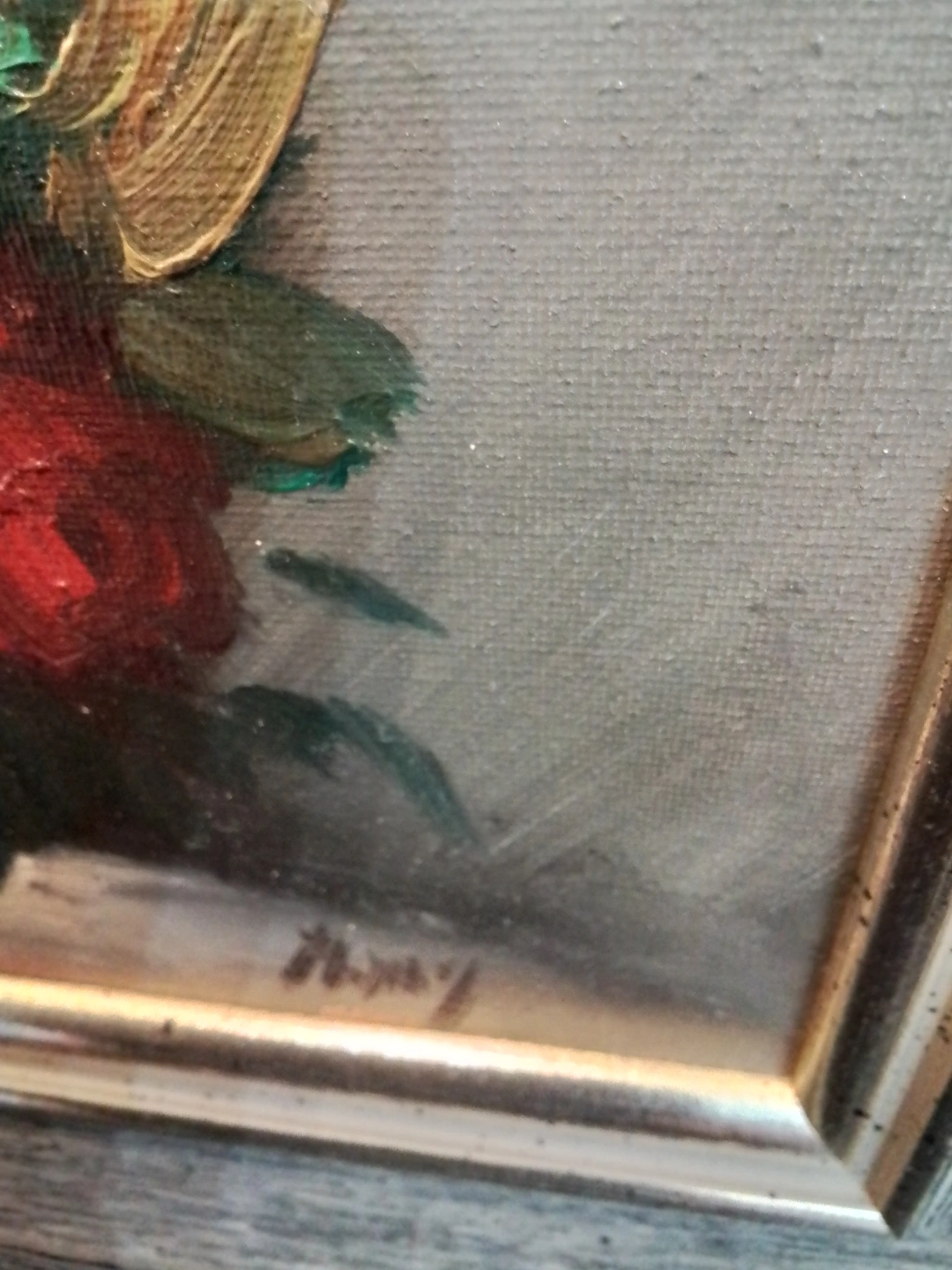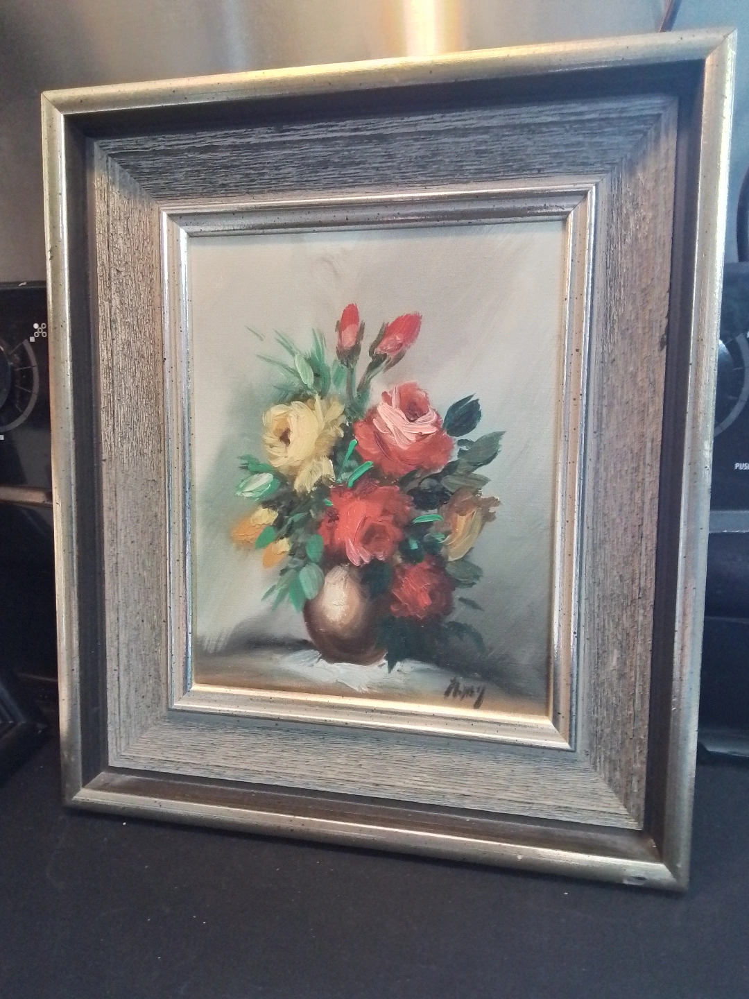 This is a framed painting of a bouquet of flowers, perfect for adding a touch of charm to any room. The colours are vibrant, and the frame is in good condition, ready to hang and enjoy! Depicts a bouquet of roses in a vase. Features red and yellow roses. Artist's signature visible in the bottom right corner.