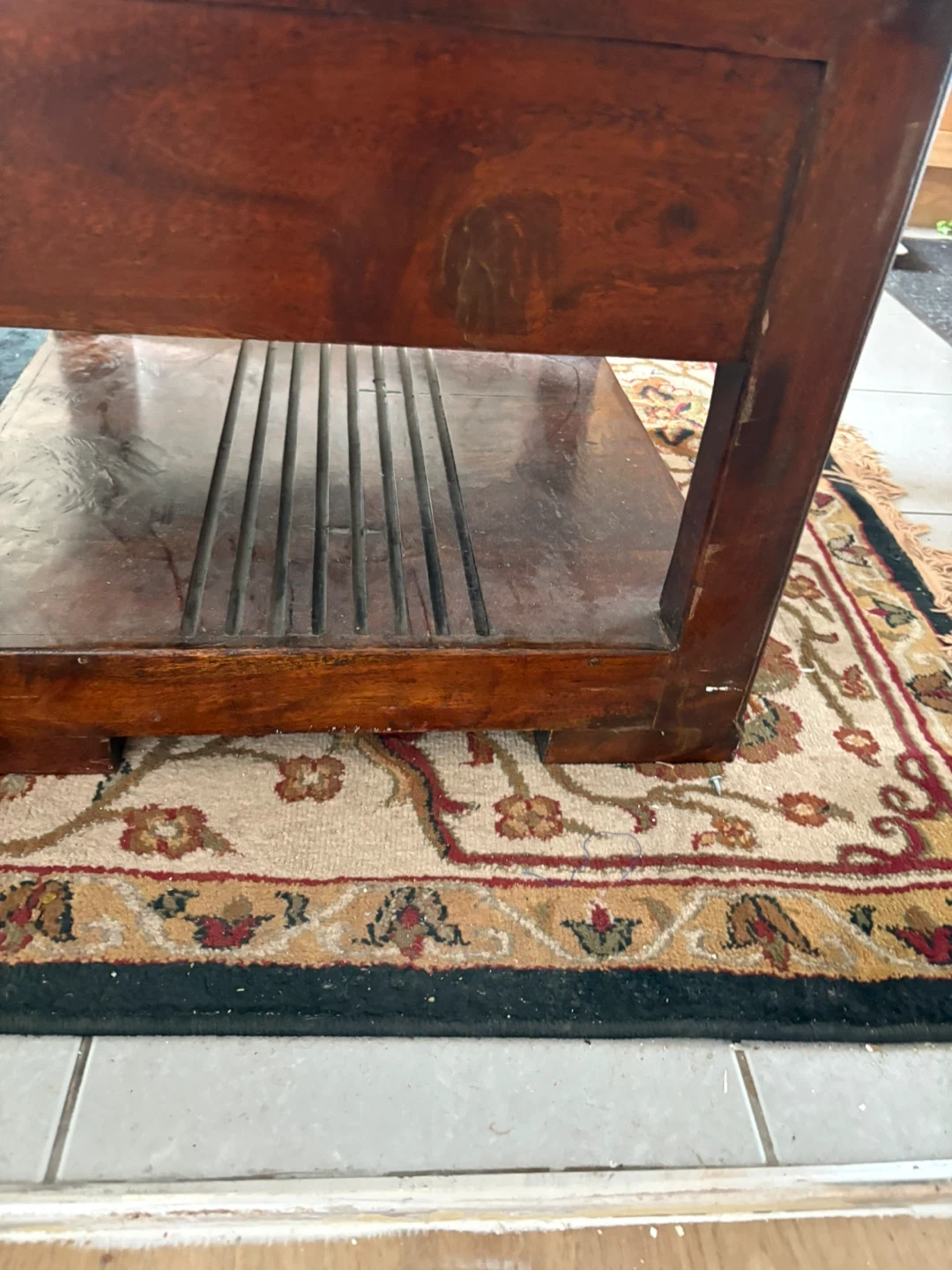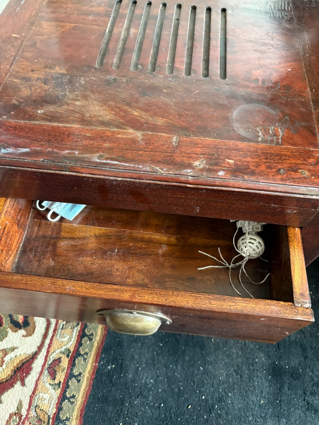 A charming wooden side table featuring a single drawer with a brass pull. It has an open shelf below with slatted detailing. The top also has ventilation slats, suggesting it might have once housed electronics. Perfect for a bedroom or living area!