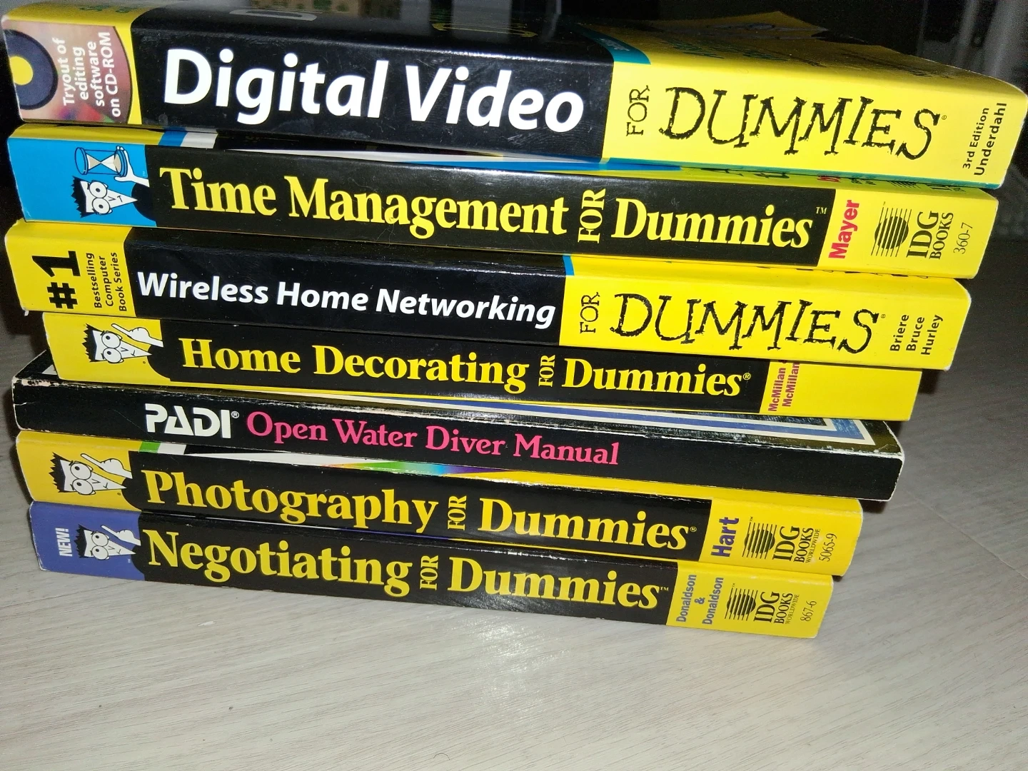 This bundle includes several 'For Dummies' books covering topics like Digital Video, Time Management, Wireless Home Networking, Home Decorating, Photography, and Negotiating. A PADI Open Water Diver Manual is also included. These books provide accessible guides on various subjects.