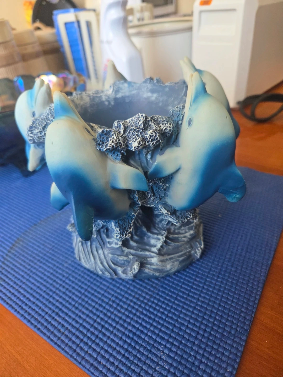 A decorative candle holder or candy pot featuring a playful dolphin design with a water effect. Made from durable resin material. Perfect for adding a touch of marine charm to your home or garden!