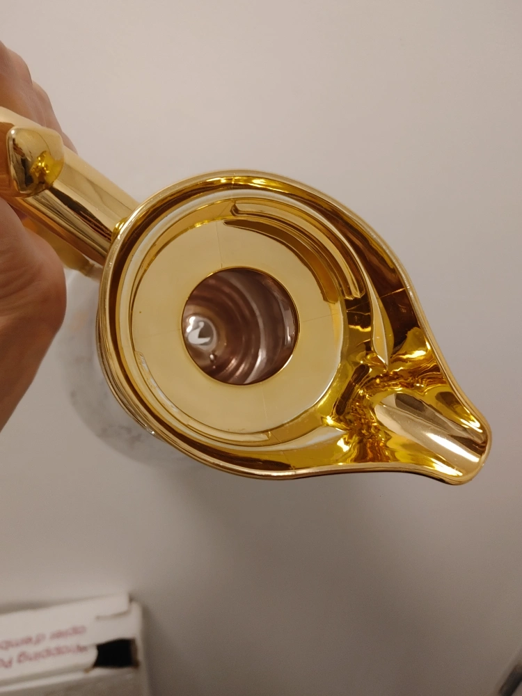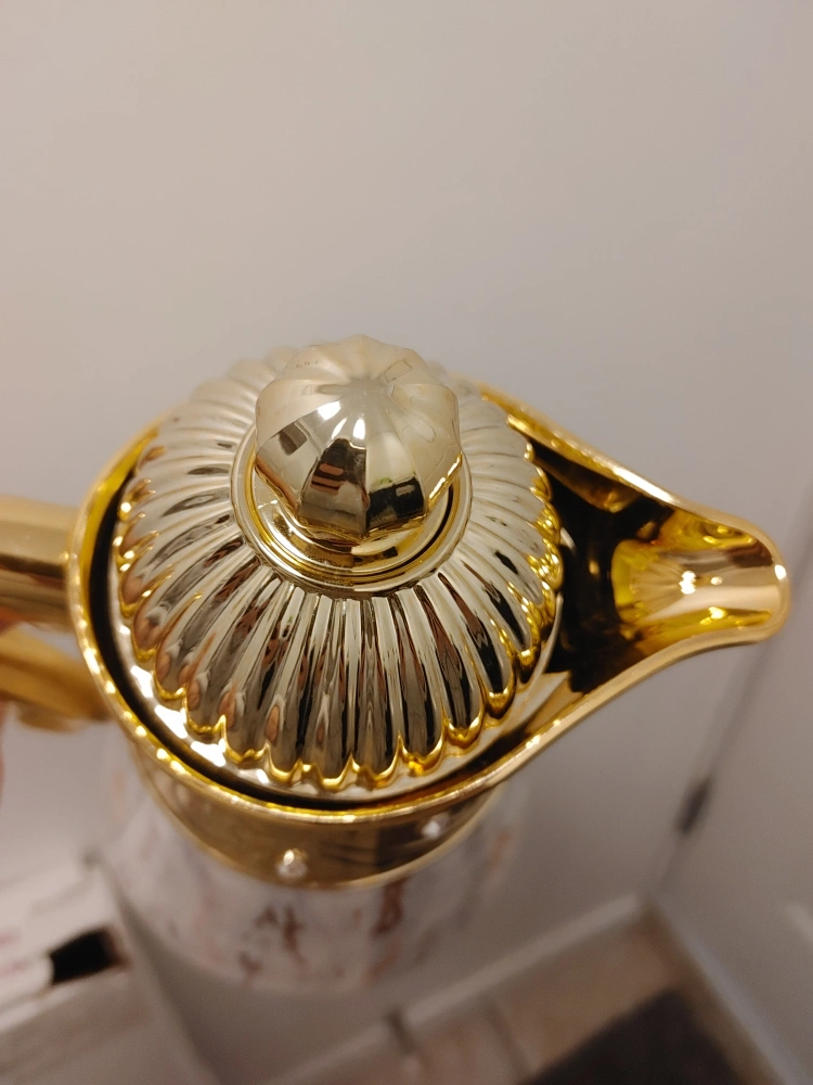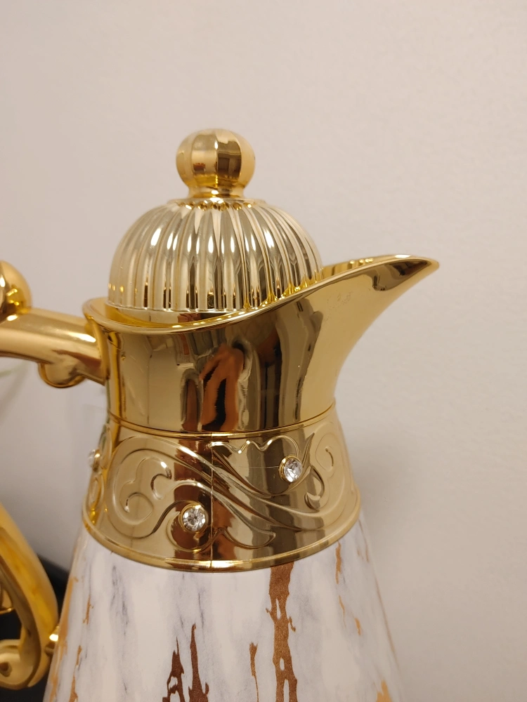 This decorative carafe features a white and gold marble pattern with ornate gold accents and sparkling gems. It's ideal for keeping beverages warm or cold for extended periods. The elegant design makes it a stylish addition to any table setting or kitchen counter.