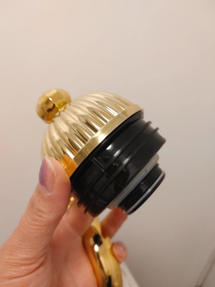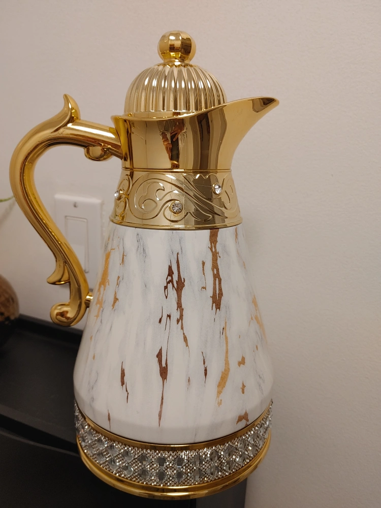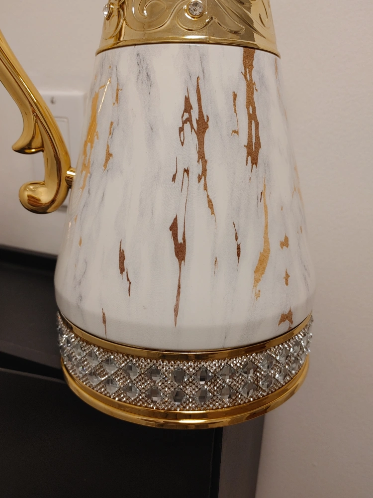 This decorative carafe features a white and gold marble pattern with ornate gold accents and sparkling gems. It's ideal for keeping beverages warm or cold for extended periods. The elegant design makes it a stylish addition to any table setting or kitchen counter.