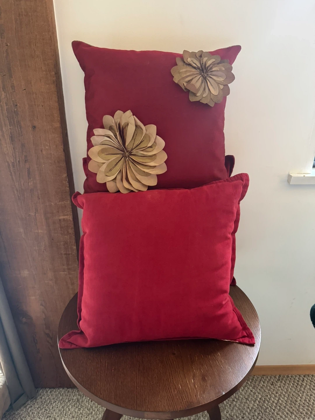 Two red throw pillows are included. Each pillow features a large, layered floral applique made of textured material. They're a lovely accent for any couch or chair!