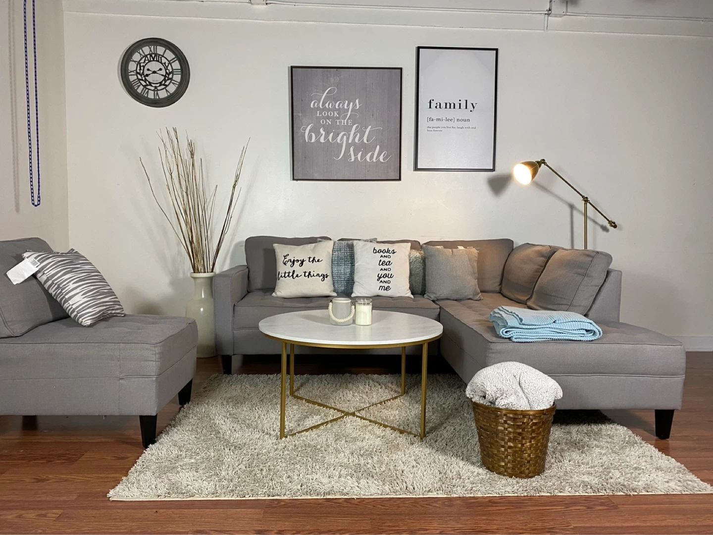 Comfortable gray fabric sectional with three separate pieces. This set has a modern design with clean lines and dark tapered legs. You can make it one sectional all pieces together. It is upholstered in a durable woven gray material. Delivery is available for this item.