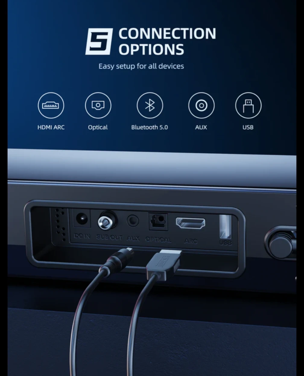 This MEREDO sound system includes a soundbar, a subwoofer, and two tower speakers for immersive audio. It offers multiple connection options like HDMI ARC, Optical, Bluetooth 5.0, AUX, and USB. Setup is easy for all devices.