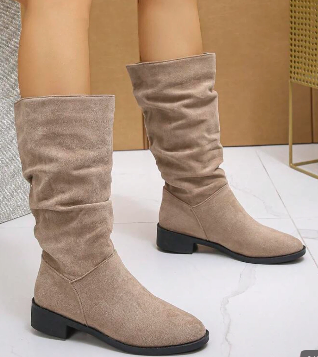 Comfortable slouch boots with a tan suede-like material. These boots have a low heel and a pull-on design. Perfect for a casual, stylish look this season!