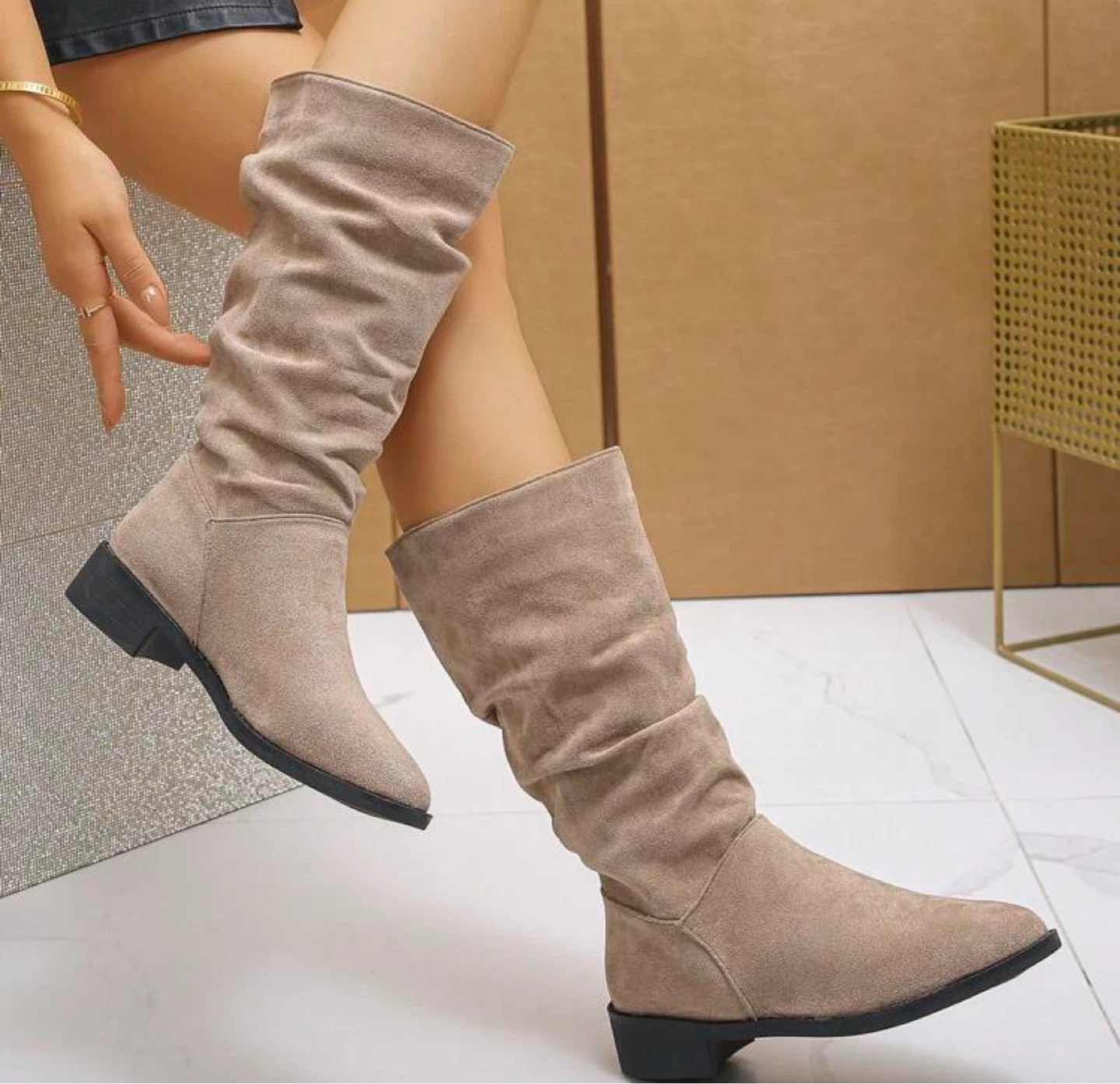 Comfortable slouch boots with a tan suede-like material. These boots have a low heel and a pull-on design. Perfect for a casual, stylish look this season!