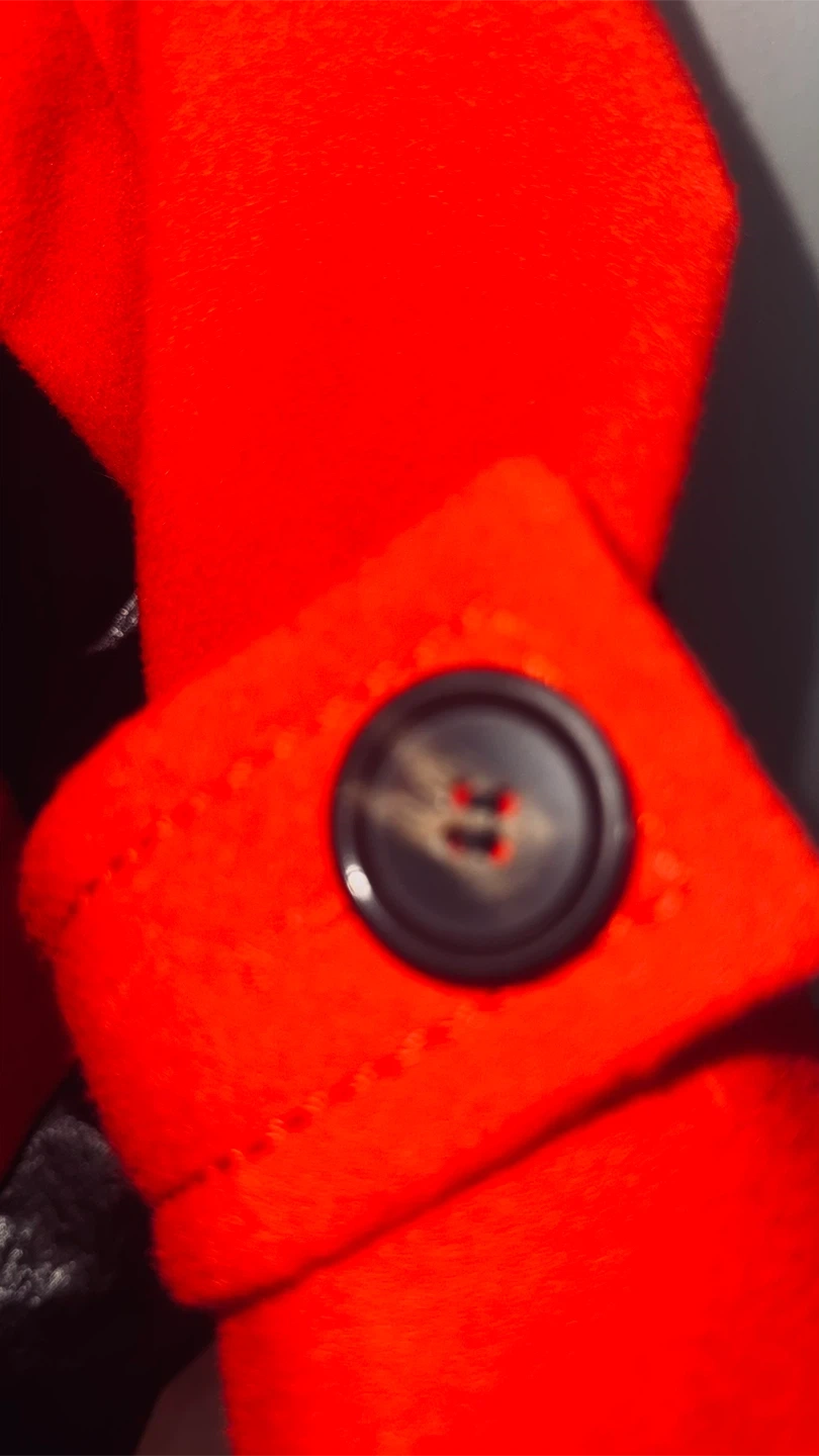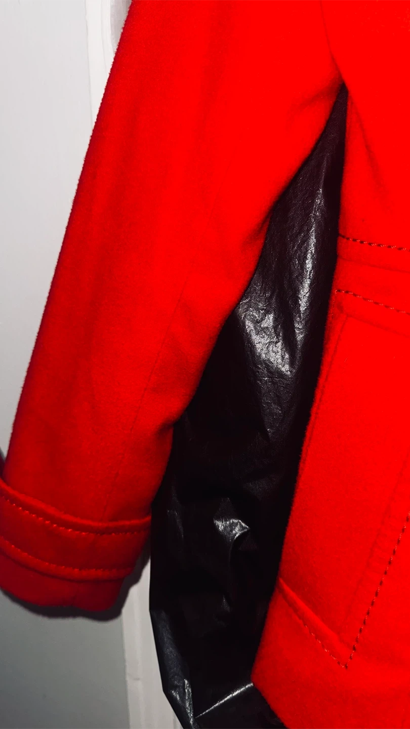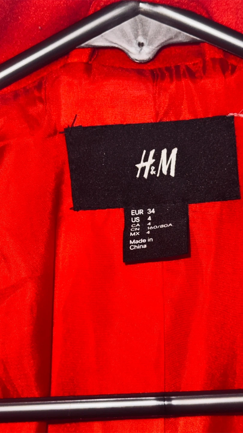 This H&M pea coat comes in a vibrant red colour. It's a double-breasted style with dark buttons. Made in China. A great coat for cooler weather!