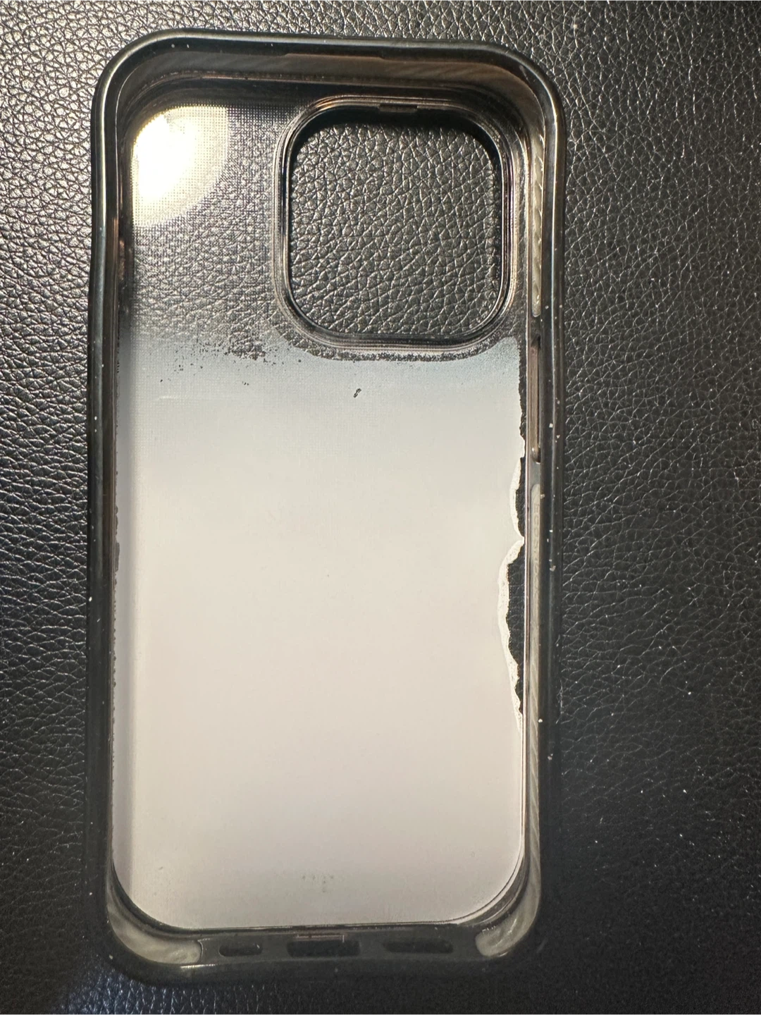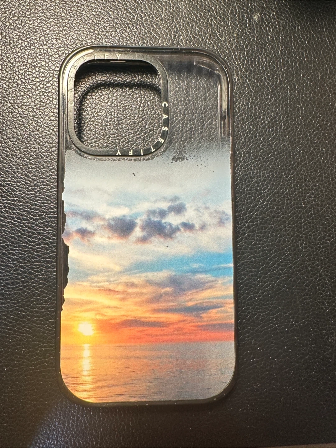 Selling a used Casetify phone case. It has a black frame and a sunset design on the back. It shows signs of wear.