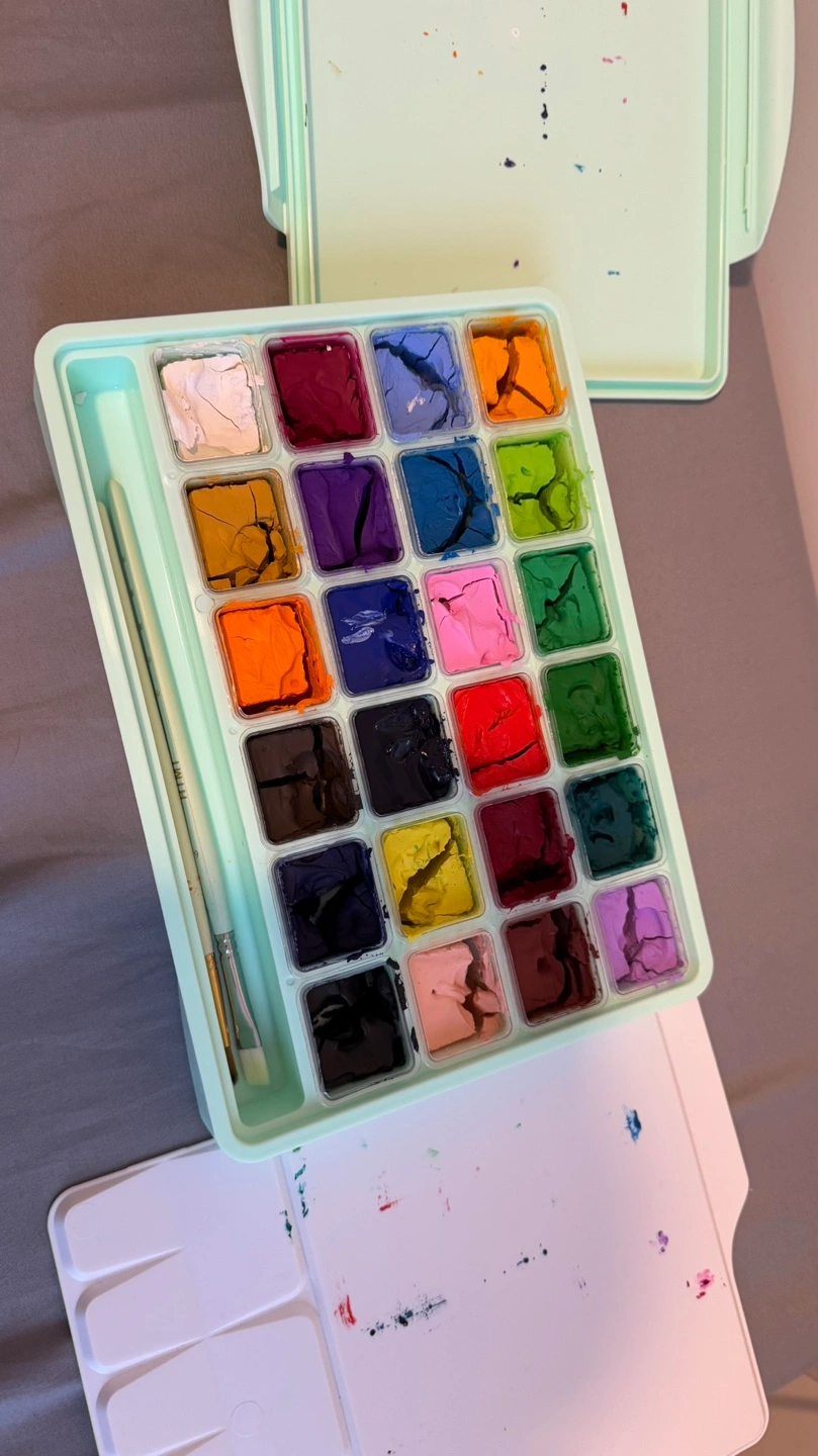 24-colour gouache paint set. Includes paint palette. Some colours used.