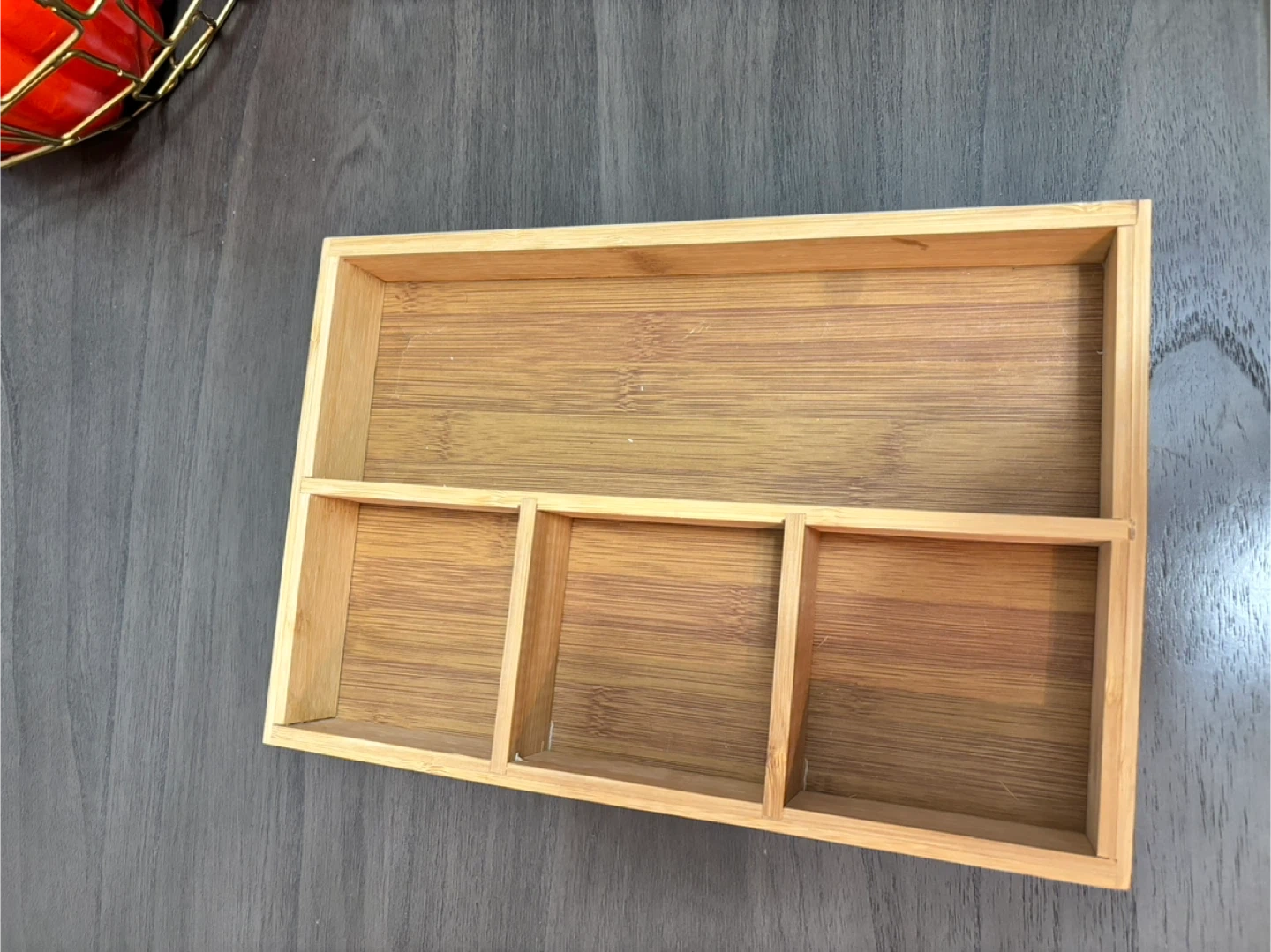 Here's a handy bamboo wooden tray organizer! It has one large compartment and three smaller square compartments. It's perfect for organizing small items on your desk or vanity. It's in great condition and ready for a new home