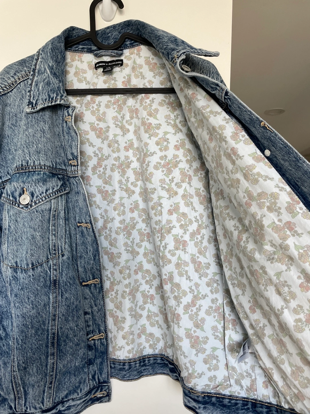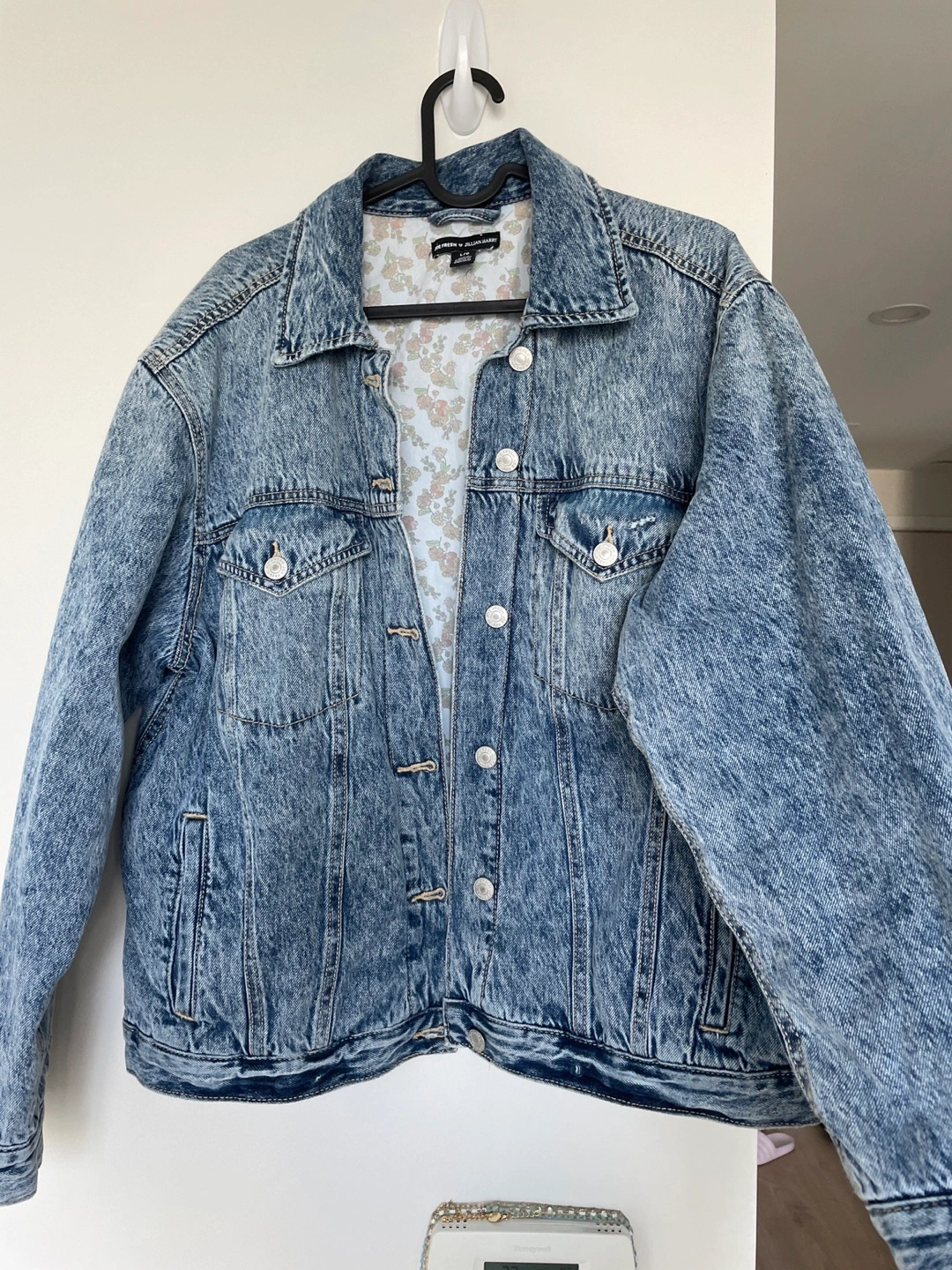 Oversized light blue acid wash denim jacket. Features a floral print lining. Size large. Excellent condition.