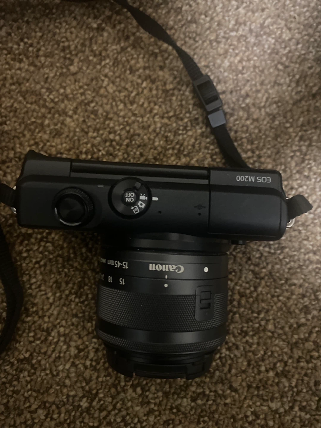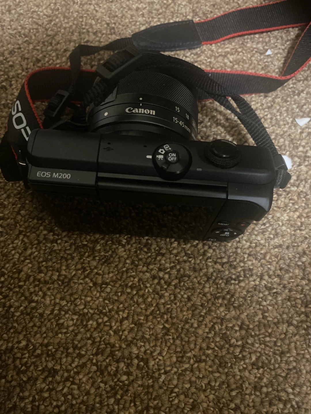 This is a black Canon EOS M200 digital camera. It includes the Canon EF-M 15-45mm zoom lens. This camera is great for capturing photos and videos on the go! No Charger unfortunately and it is dead but still working!