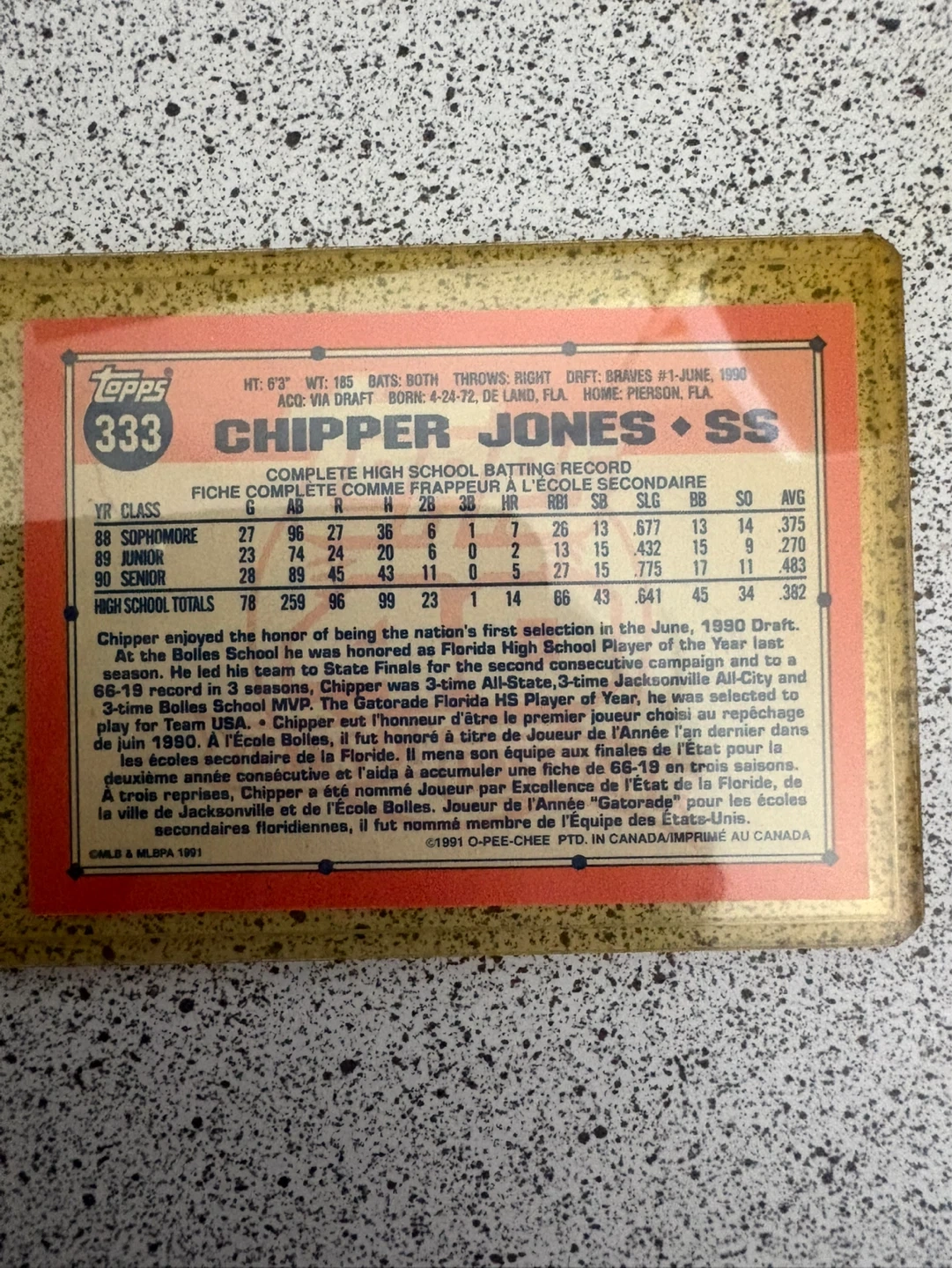 This is the Topps #333 baseball card featuring Chipper Jones in his SS position. It's from the 1990 season with a draft pick notation. The card includes his complete high school batting record. Old case holding card case is yellow not the card