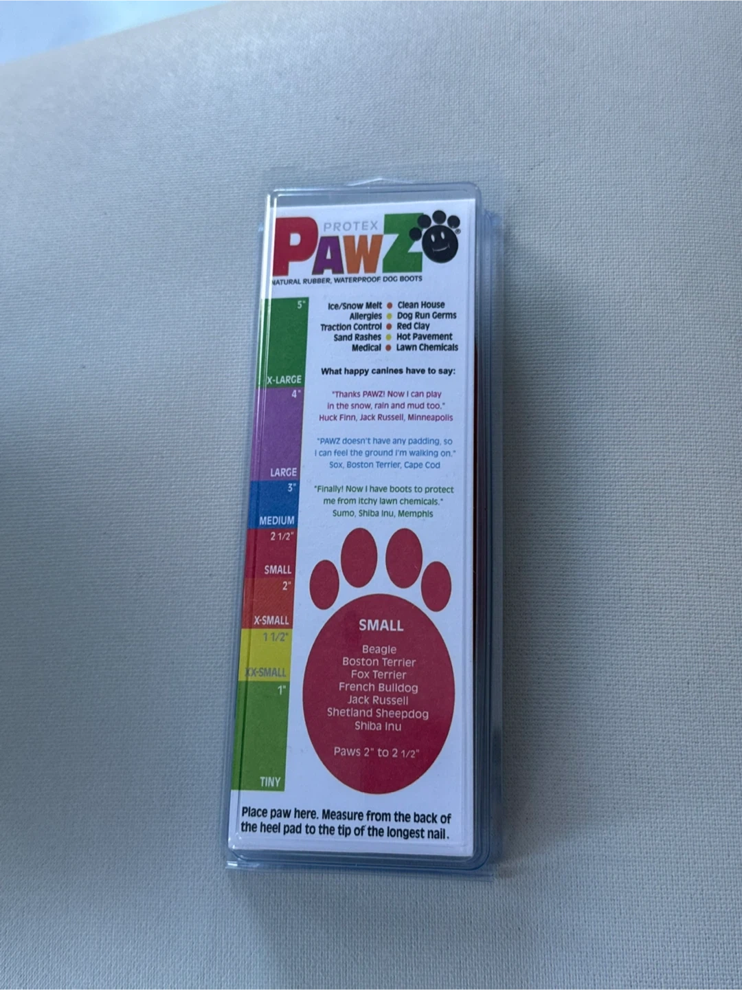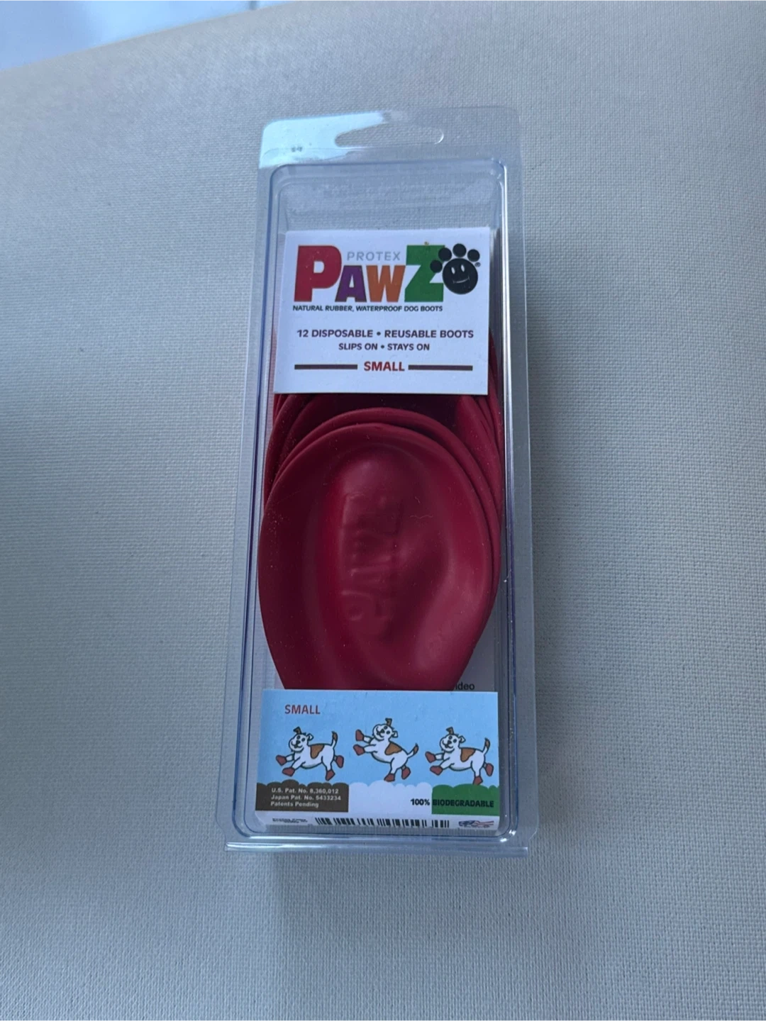 Pawz dog boots are made of natural rubber, offering waterproof protection. They are designed for slips on and stays on, and come in a pack of 12. This size is small, suitable for paws up to 2 1/2 inches. 10 boots remaining, never used.
