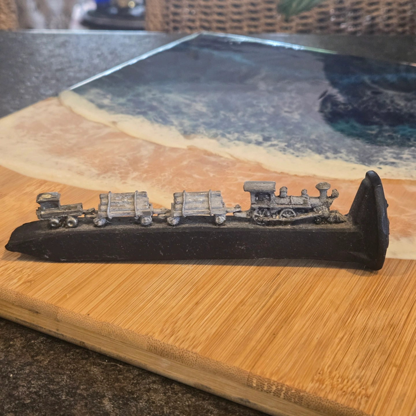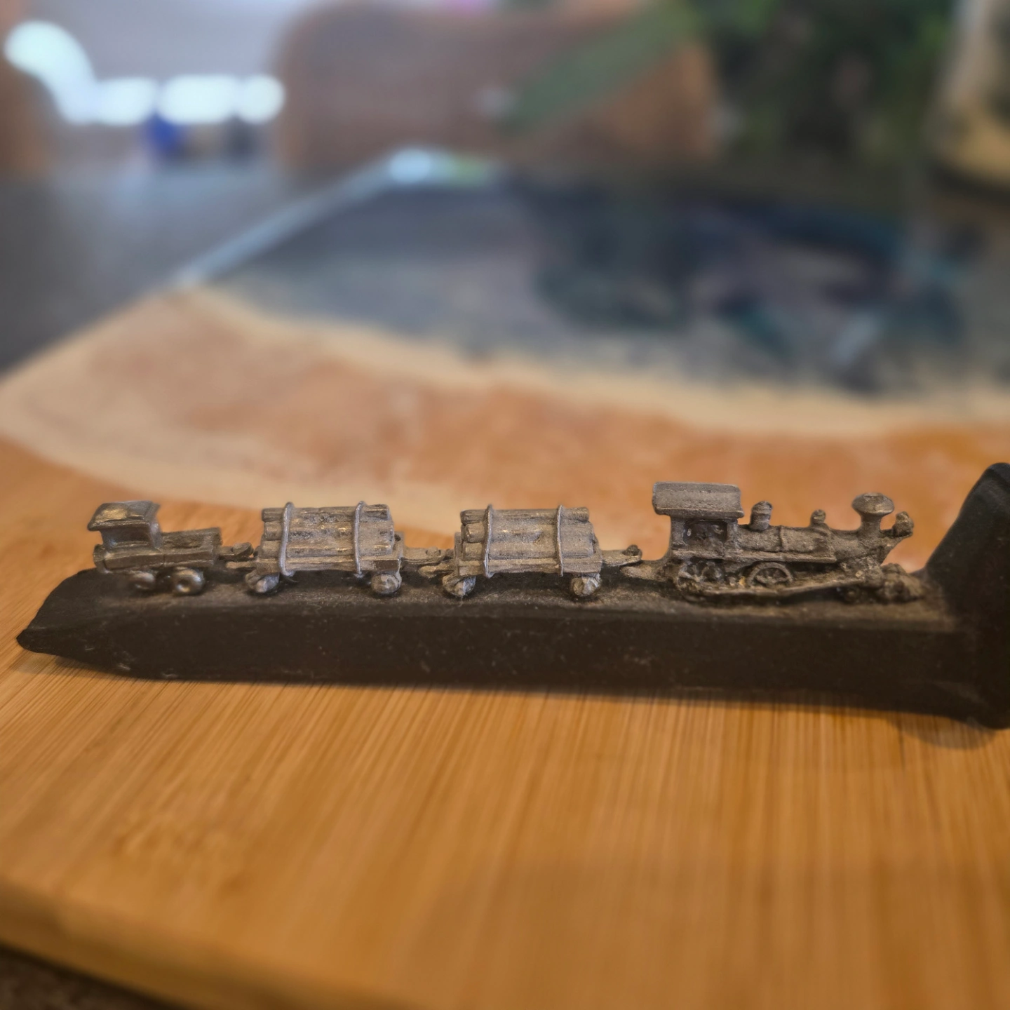 Vintage Pewter Train hauling logs mounted on Railroad Spike