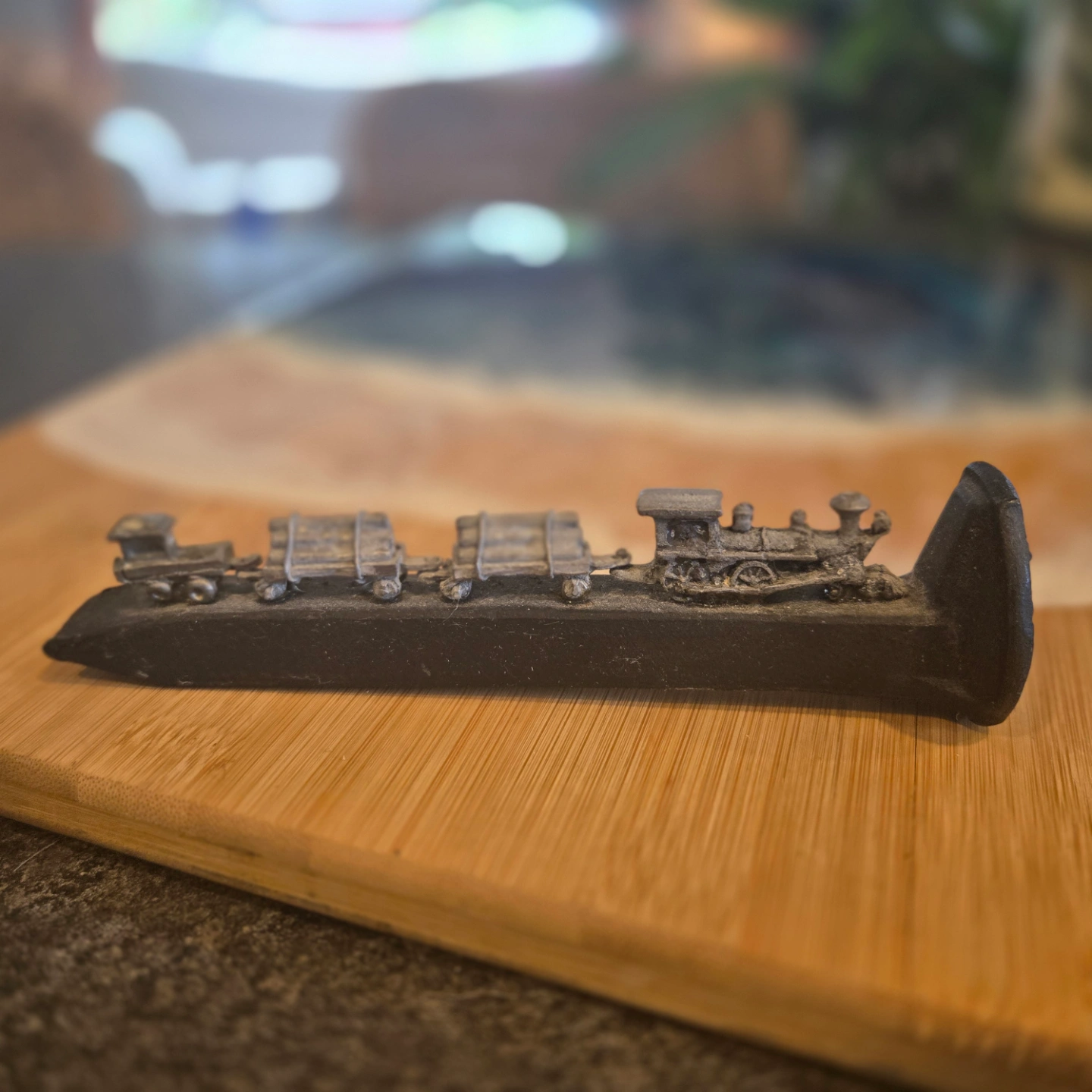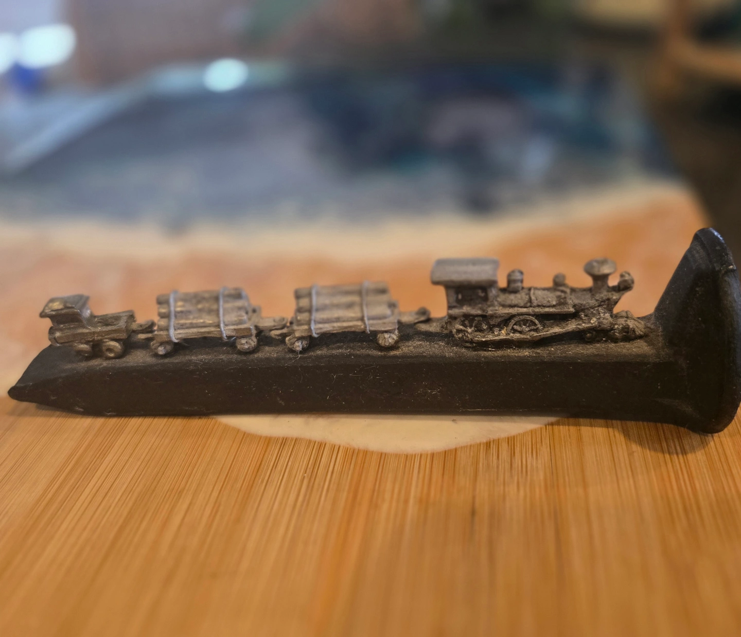 Pewter train hauling logs mounted on a railroad spike. Very detailed. Great conversation piece and perfect for train collectors.