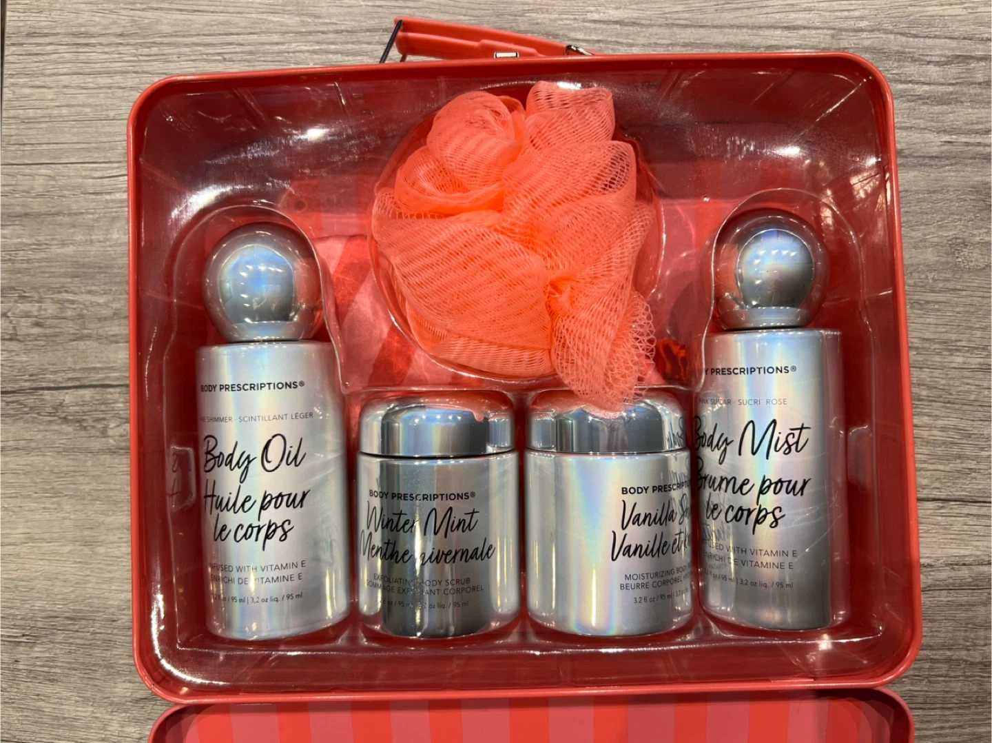This Body Prescriptions Jet Set Kit includes body oil, body mist, winter mint body scrub, vanilla shea body butter, and a mini body sponge. Each product is 3.2 fl oz / 95 mL. It's all packed in a cute tin case!