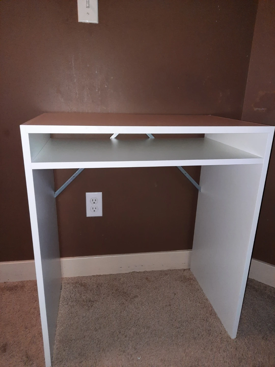 This is a simple Ikea TORALD white desk with a shelf underneath. It's a good size for a computer or writing. It's sturdy and has a clean, modern look.