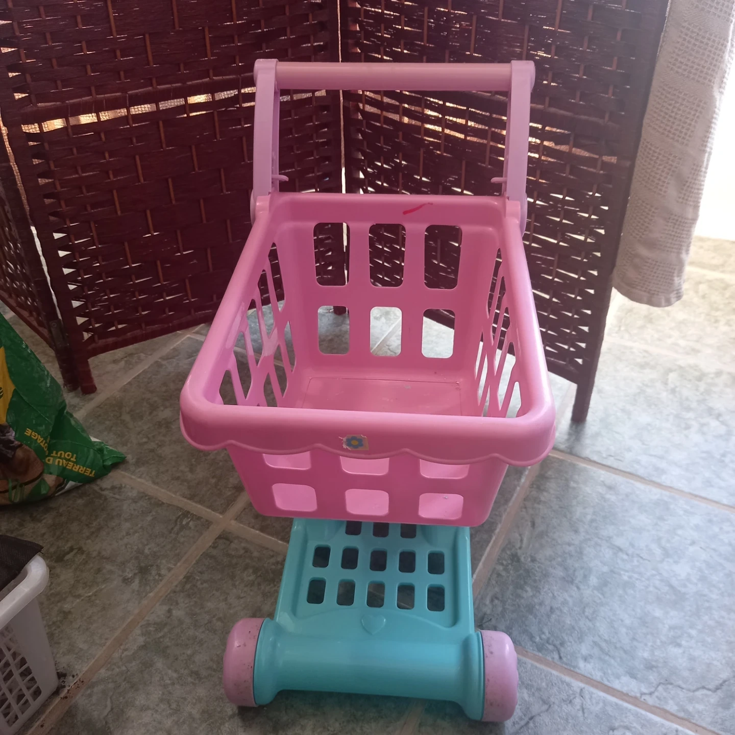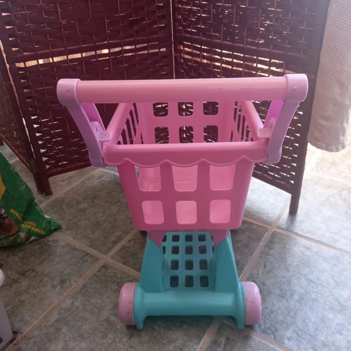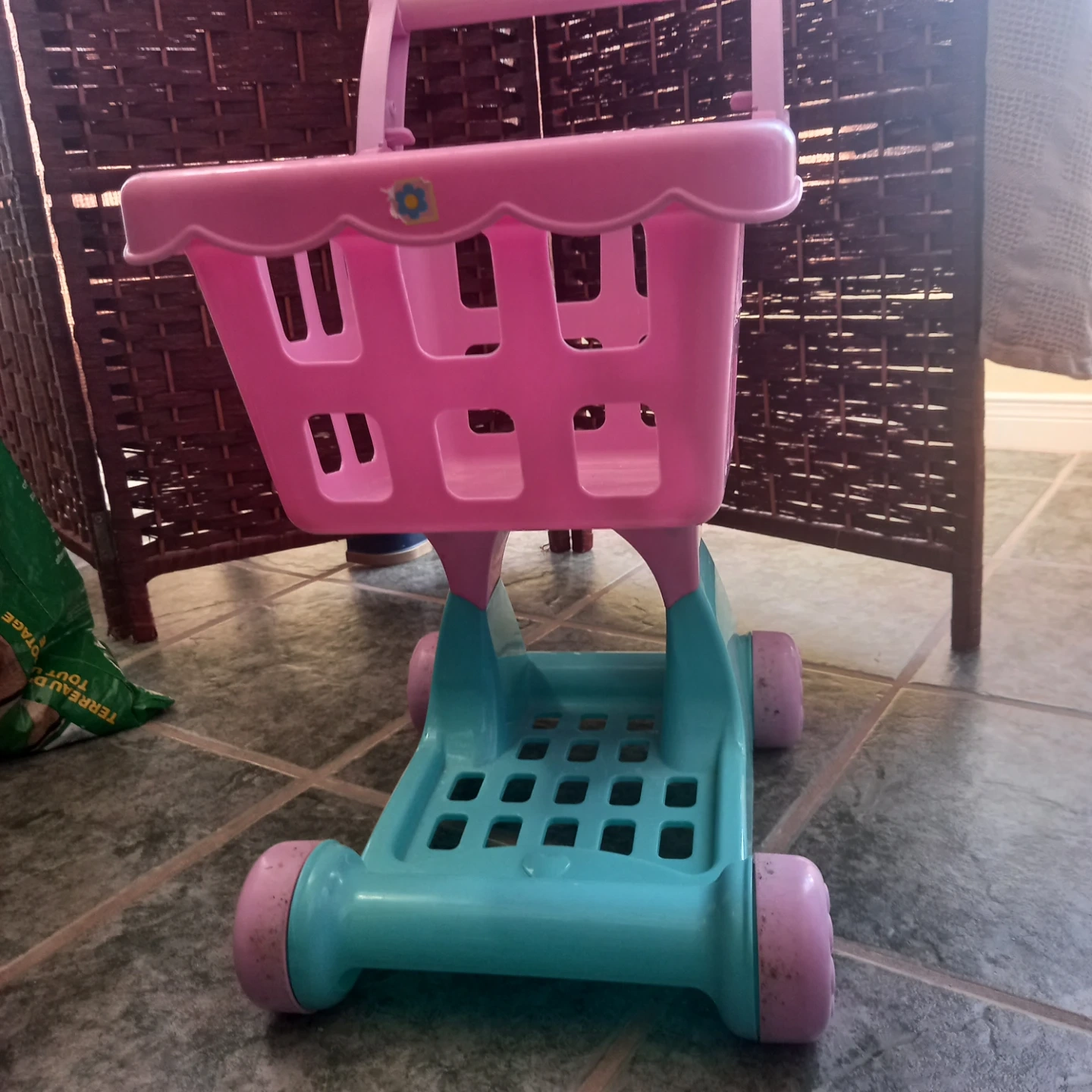 This is a fun pink and teal toy shopping cart for kids. It's made of plastic and perfect for pretend play. Great for little ones who love to imitate grown-ups!