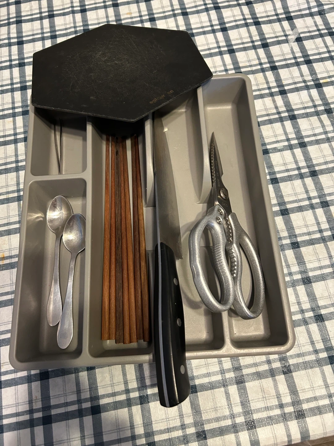 Declutter your drawers with this handy kitchen utensil organizer tray! It's perfect for keeping your spoons, chopsticks, scissors, and other kitchen tools neatly arranged. It also comes with a black cutting board on the side.