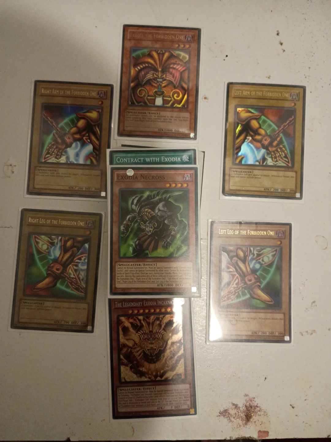 This lot includes multiple Yu-Gi-Oh! cards that make up Exodia, the Forbidden One. Cards include Exodia the Forbidden One, Exodia Necross, The Legendary Exodia Incarnate, Contract with Exodia, Right Arm of the Forbidden One, Left Arm of the Forbidden One, Right Leg of the Forbidden One, and Left Leg of the Forbidden One. The cards are in protective sleeves.all from legend of blue eyes original 1996 booster pack not the reprint or anniversary edition