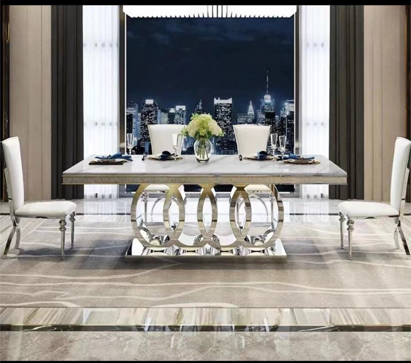 Stylish Dining Table: The exquisite marble tabletop is complemented by a sleek, rotating gold base, providing a sophisticated look that impresses guests and enhances any dining occasion.