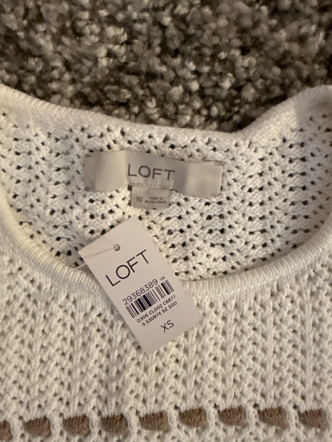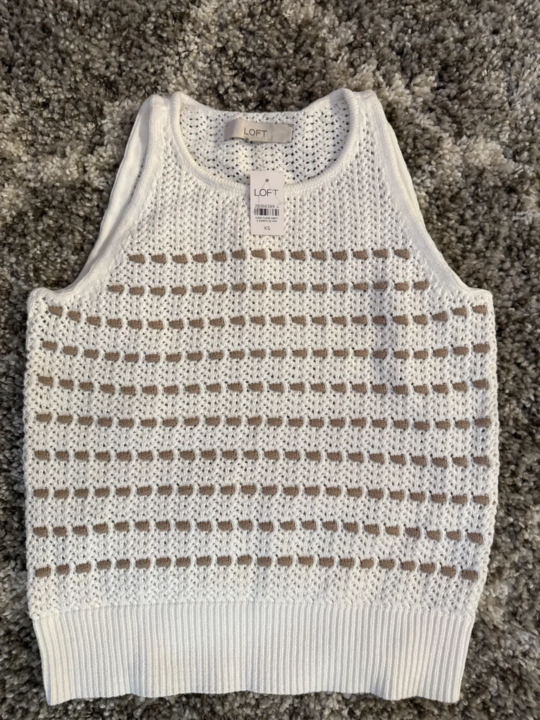 This is a women's white knit tank top from LOFT. It's a size XS. The material is a textured knit with a brown patterned detail.
