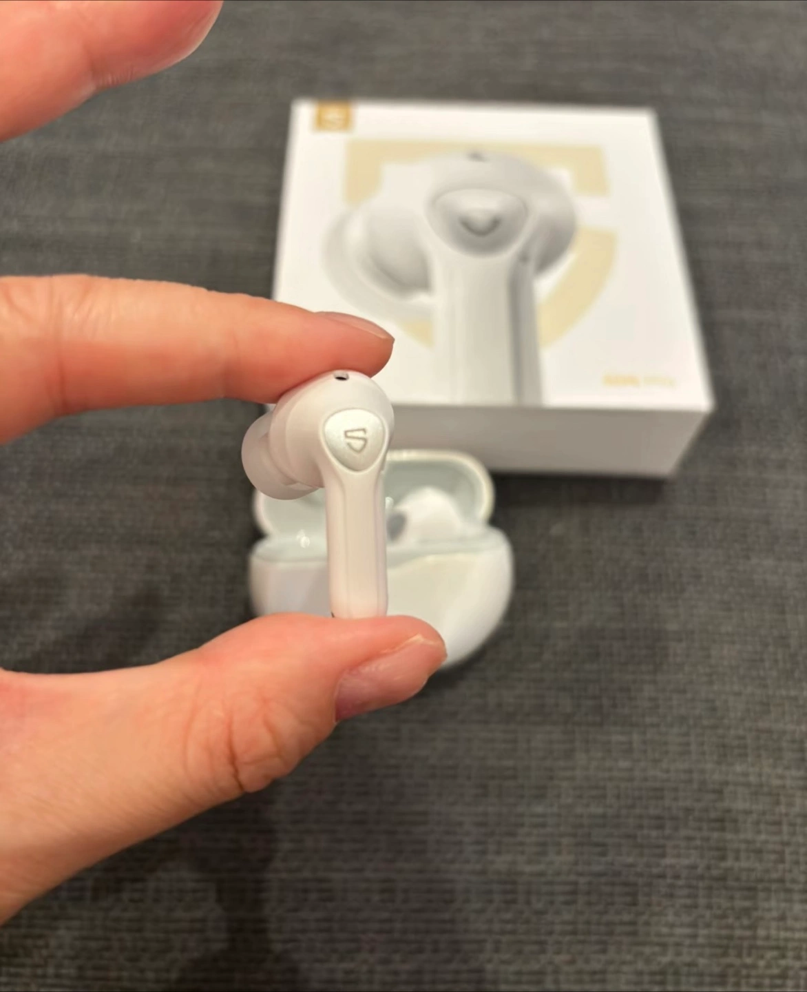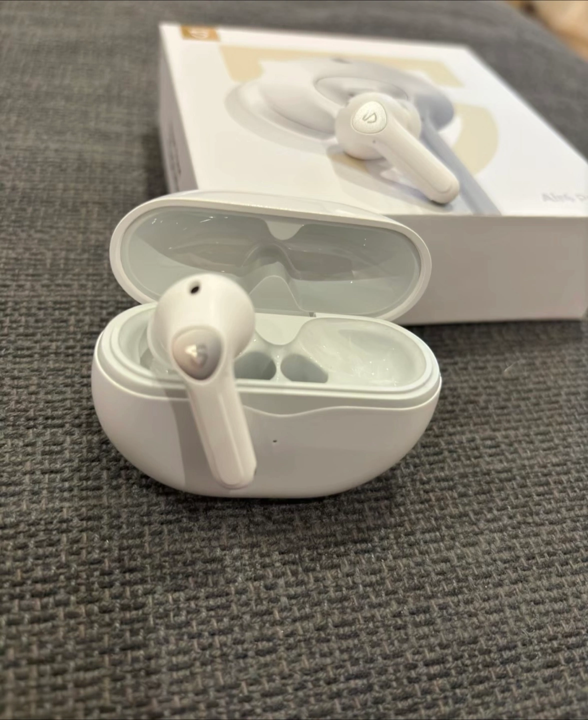 White earbuds with charging case. Features hybrid active noise cancellation and 26 hours of playtime. 13mm dynamic driver. Mint condition.